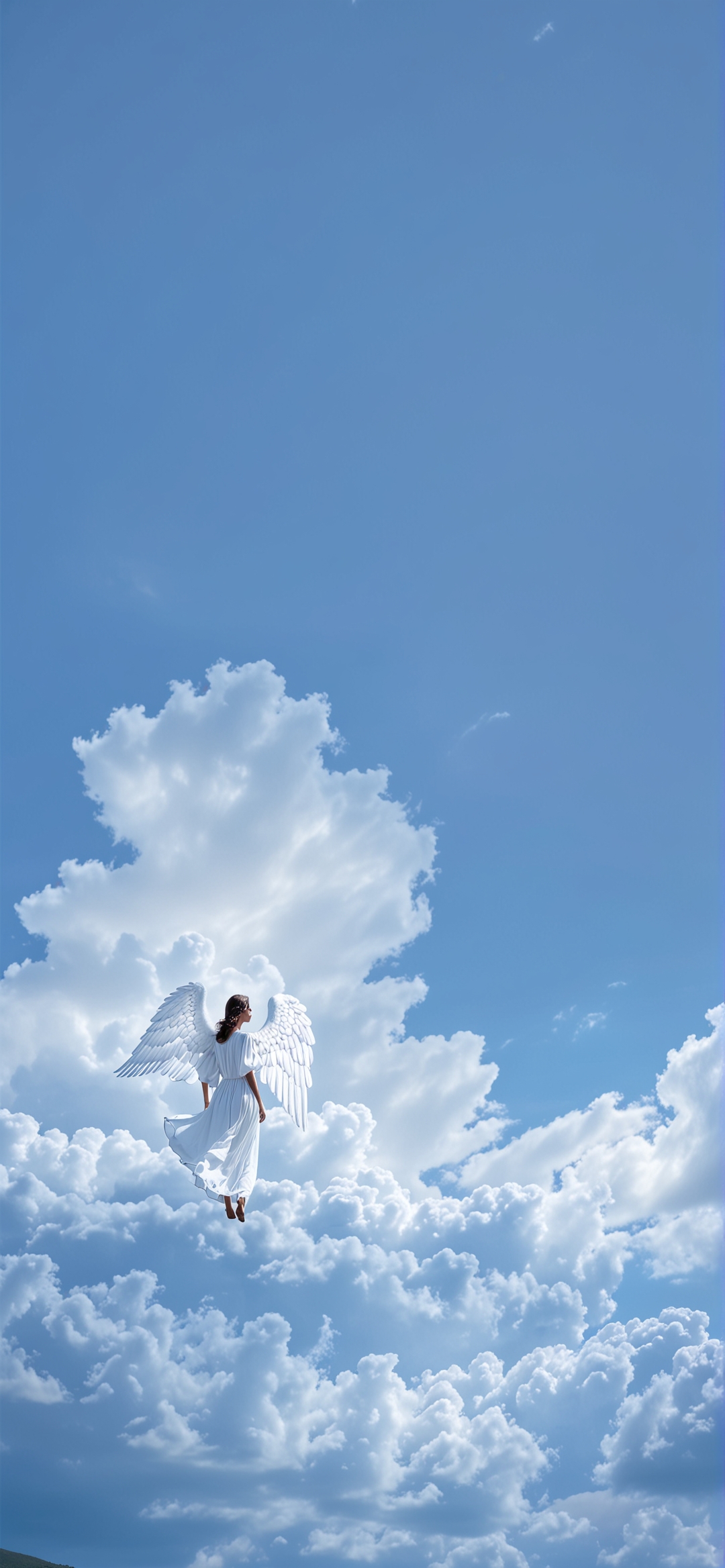 云端天使梦幻翱翔图:巨大白翼与宁静蔚蓝