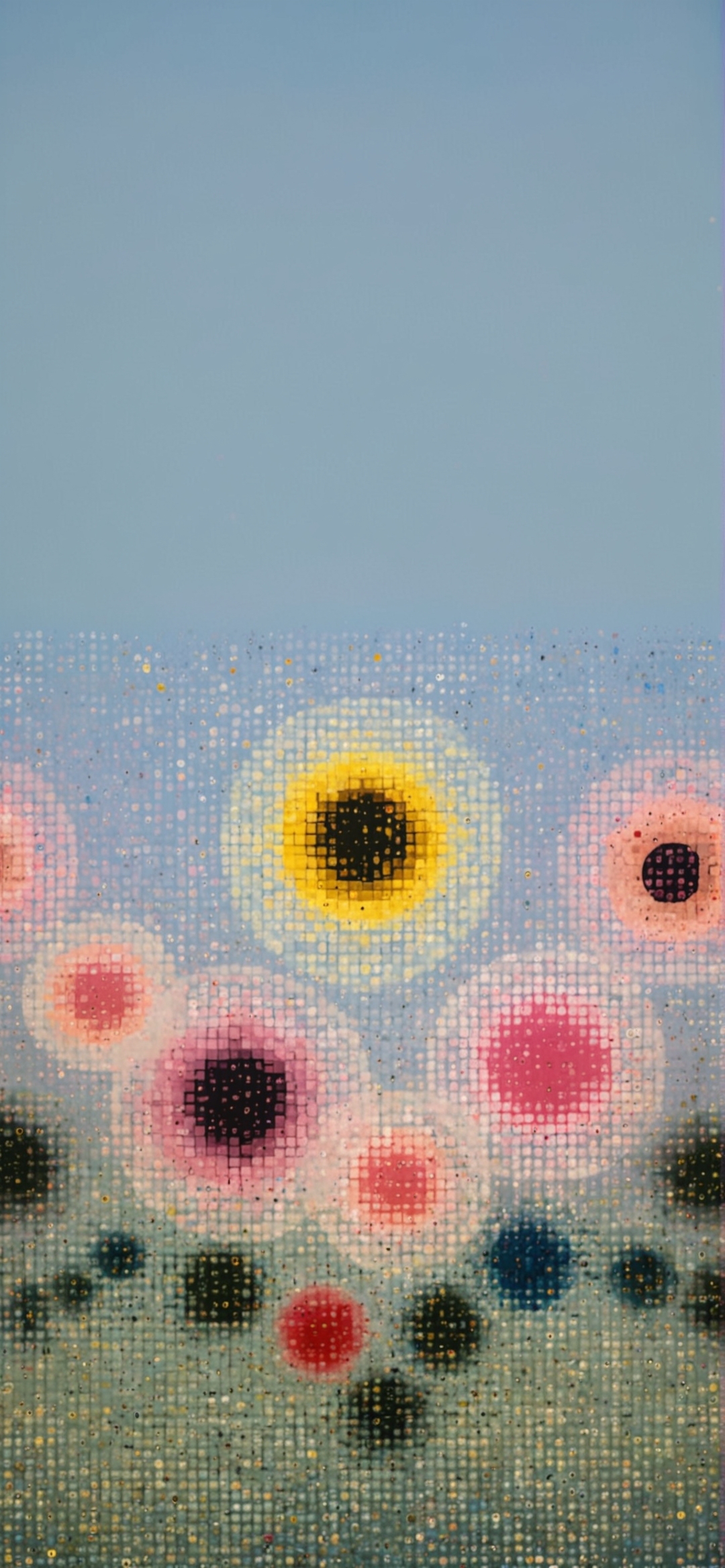 一幅抽象画的照片。这件艺术品的背景是纯蓝色的。画布底部三分之一的地方布满了彩色的小圆点,形成了一片粉色、黄色、红色和白色的散焦花朵。花朵的背景是浅一点的背景上的蓝灰色圆点。这些点大小大致相同,间隔均匀。整体印象是一种精致的美。