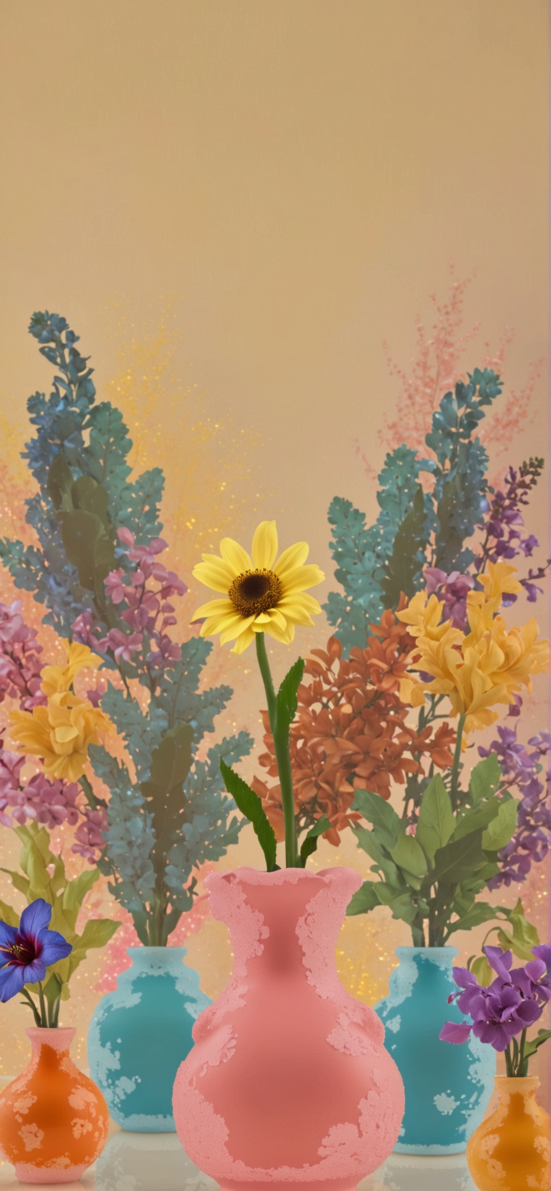 这是一个充满活力的花卉布置的渲染图像,背景是柔和的浅橙色。五个不同颜色和纹理的花瓶,每个都包含不同类型的花,排列在反射表面上。照片的焦点是一朵明亮的黄色向日葵,它被放置在前景中一个有纹理的泡泡糖粉色花瓶中。构图与其他色彩鲜艳的花朵相平衡,包括蓝色、紫色和橙色的花朵,营造出欢快和谐的氛围。这张照片采用了柔焦和轻微柔和的调色板,给场景增添了复古和梦幻般的品质。