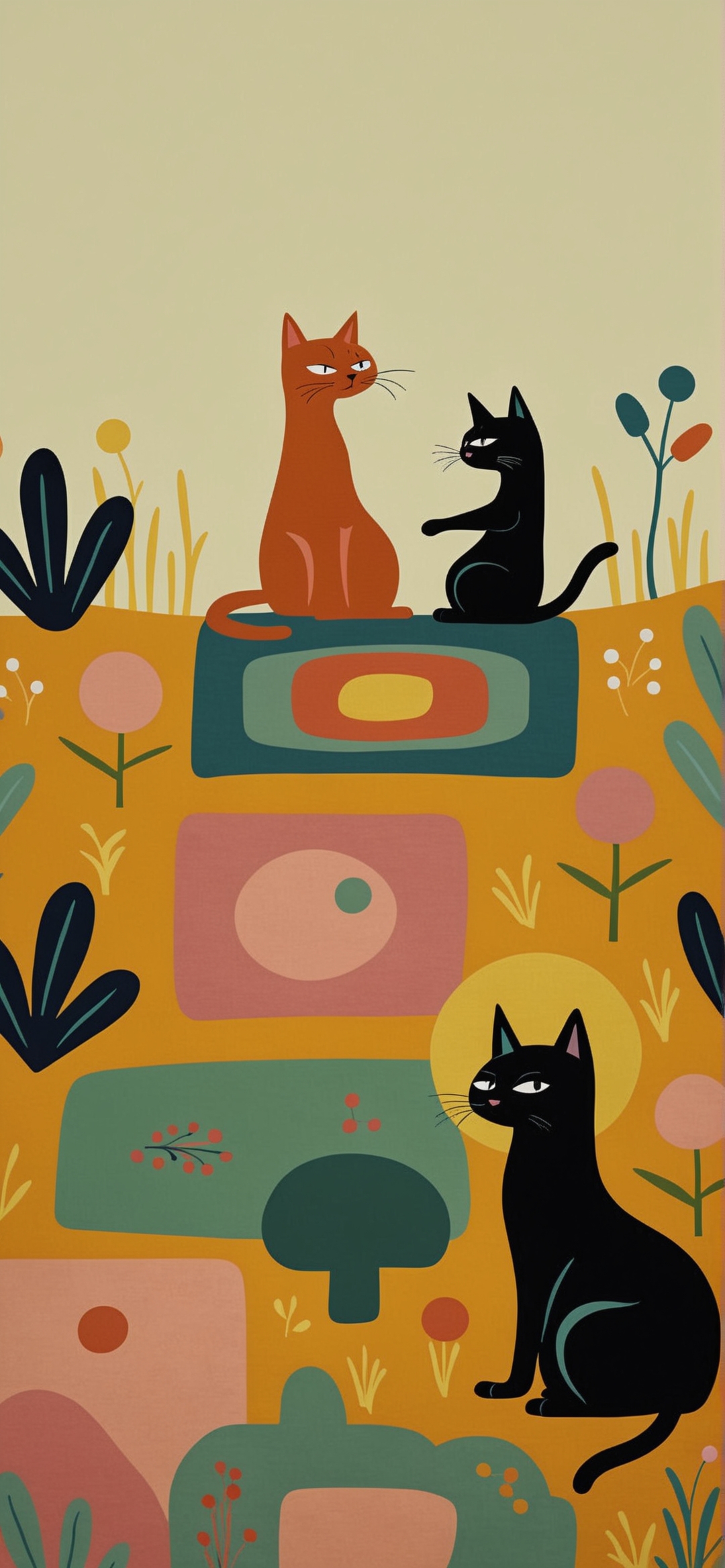 三只猫在抽象背景下的渲染图像。背景是一个平面矢量艺术风格的各种有机形状,线条和点在芥末黄,青色,桃色和黑色的有限调色板。其中两只猫是黑色的,一只是橙色的。这三只猫都有同样简单的圆形设计和尖锐的尖耳朵。背景中,一只黑猫和橙色的猫面对面坐着,而另一只黑猫坐在前景的一边,背对着观众,从肩膀上看过去。这一幕唤起了三只猫之间一种顽皮而又略带紧张的动态,可能反映了领土争端或顽皮对峙的时刻。