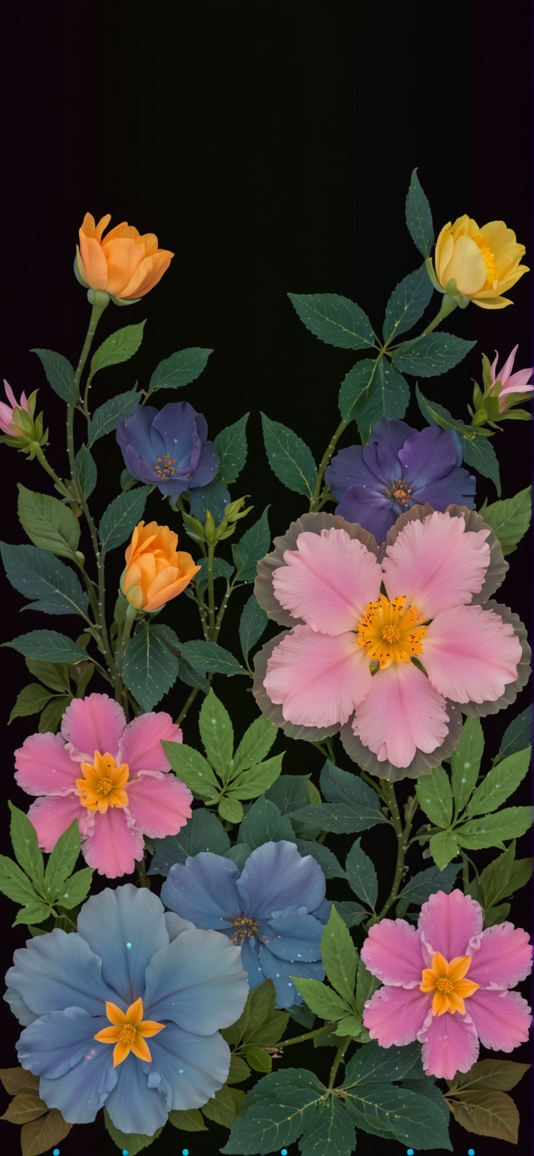 这是一张以黑色背景为背景的插花照片。这个花束的特点是各种各样的花朵,颜色鲜艳,包括粉红色、黄色、橙色和蓝色。鲜花盛开,花瓣娇嫩柔软。绿叶与鲜艳的花朵形成自然的对比。微小的光点散布在整个布置中,增添了一丝奇思妙想。