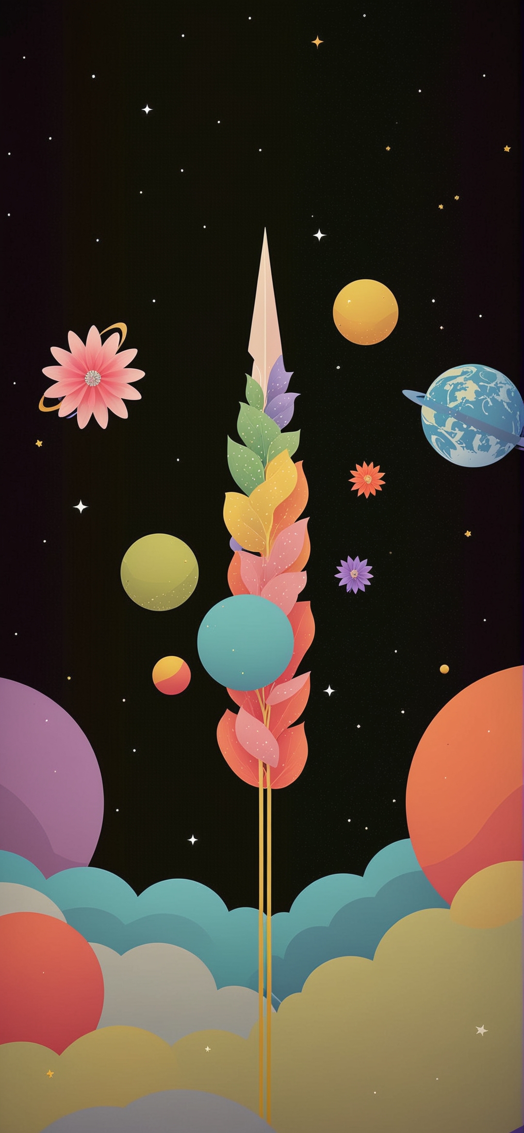 梦幻环保火箭夜空之旅:星光下的斑斓叶舟与异彩行星