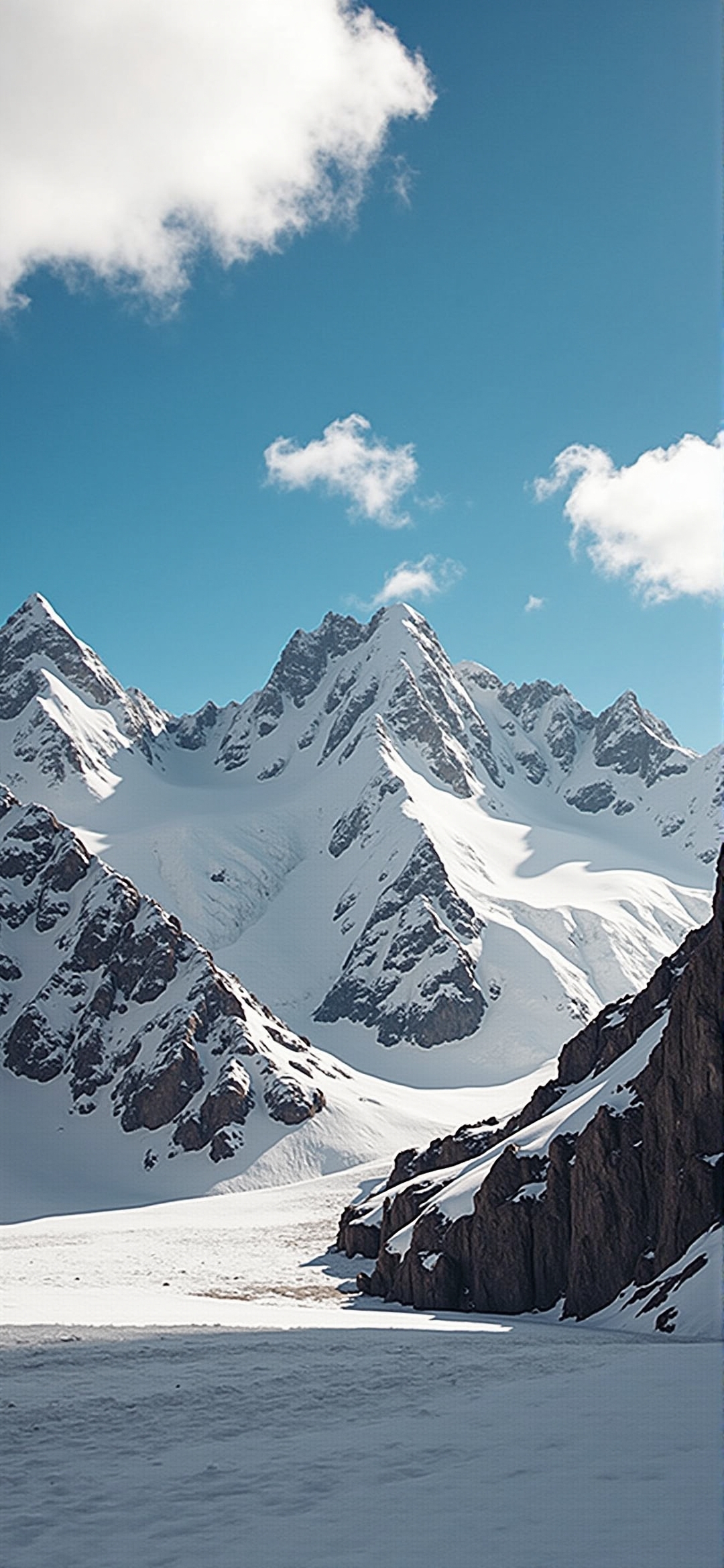 这张照片拍摄的是一片广阔的、白雪覆盖的山脉,蓝天下点缀着蓬松的白云。这张照片是从低角度拍摄的,强调了山峰的雄伟和壮观。阳光在雪地上投下戏剧性的阴影,突出了山脉的纹理和轮廓。前景的特点是一大片平滑的雪,可能是一个冰冻的湖泊或冰川,与崎岖的岩石地形形成鲜明对比。整体印象是一种宁静的美丽和令人敬畏的自然力量。