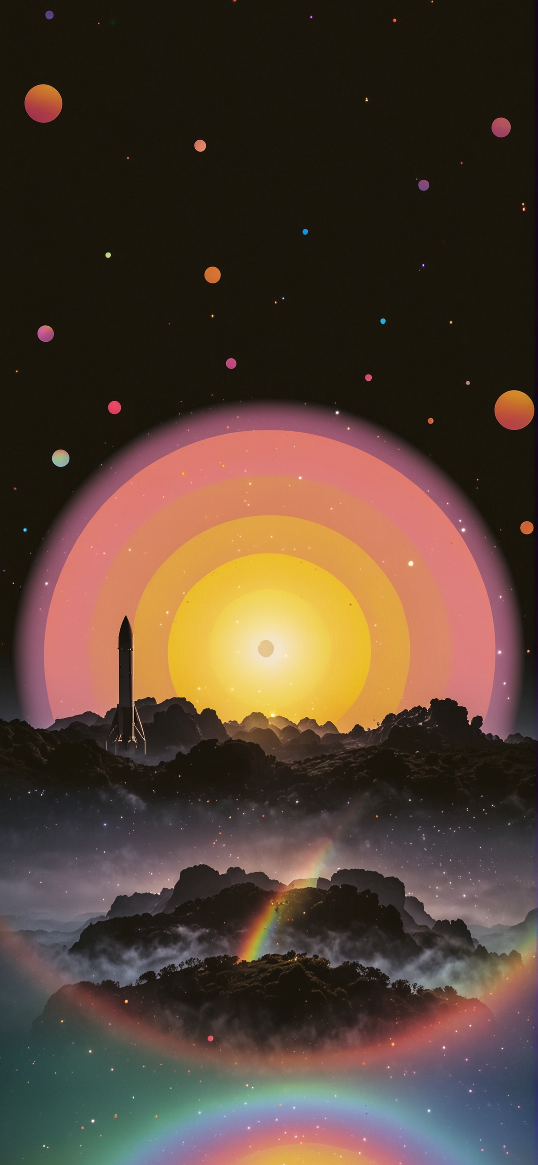 蓄势待发火箭映彩虹:现实主义与图形设计交融的梦幻启航画面