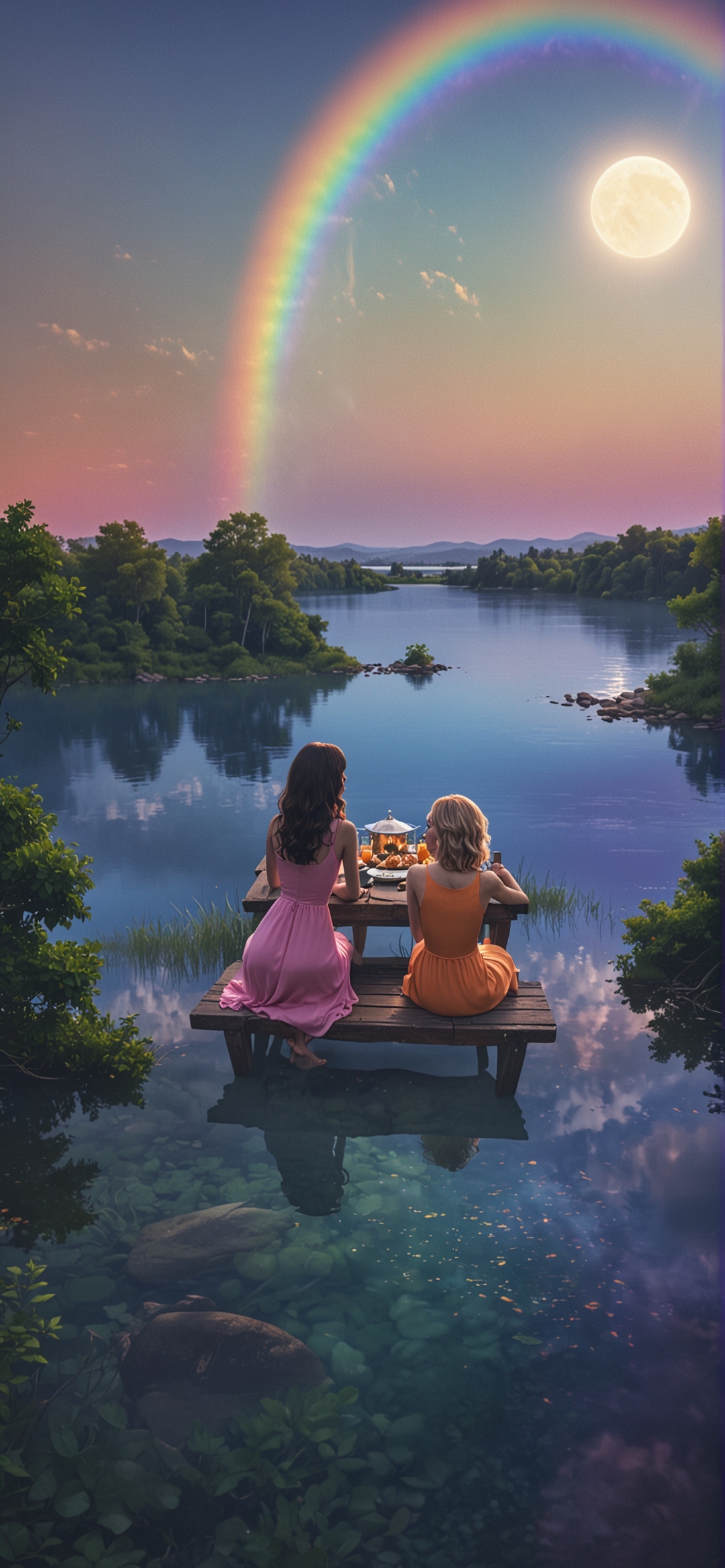 两个女人在湖边享受宁静的早餐。这幅图片展示了一个风景如画的场景,一个充满活力的彩虹横跨天空,满月照亮了暮色,郁郁葱葱的绿色植物构成了景观。这些女人背对着观众,坐在淹没在湖水中的木码头上,露出下面游动的鱼。他们放松的姿势和共同的食物暗示了在令人惊叹的自然景观中片刻的宁静和友谊。图像的整体色调是梦幻和空灵的,柔和的灯光和有点超现实的气氛。