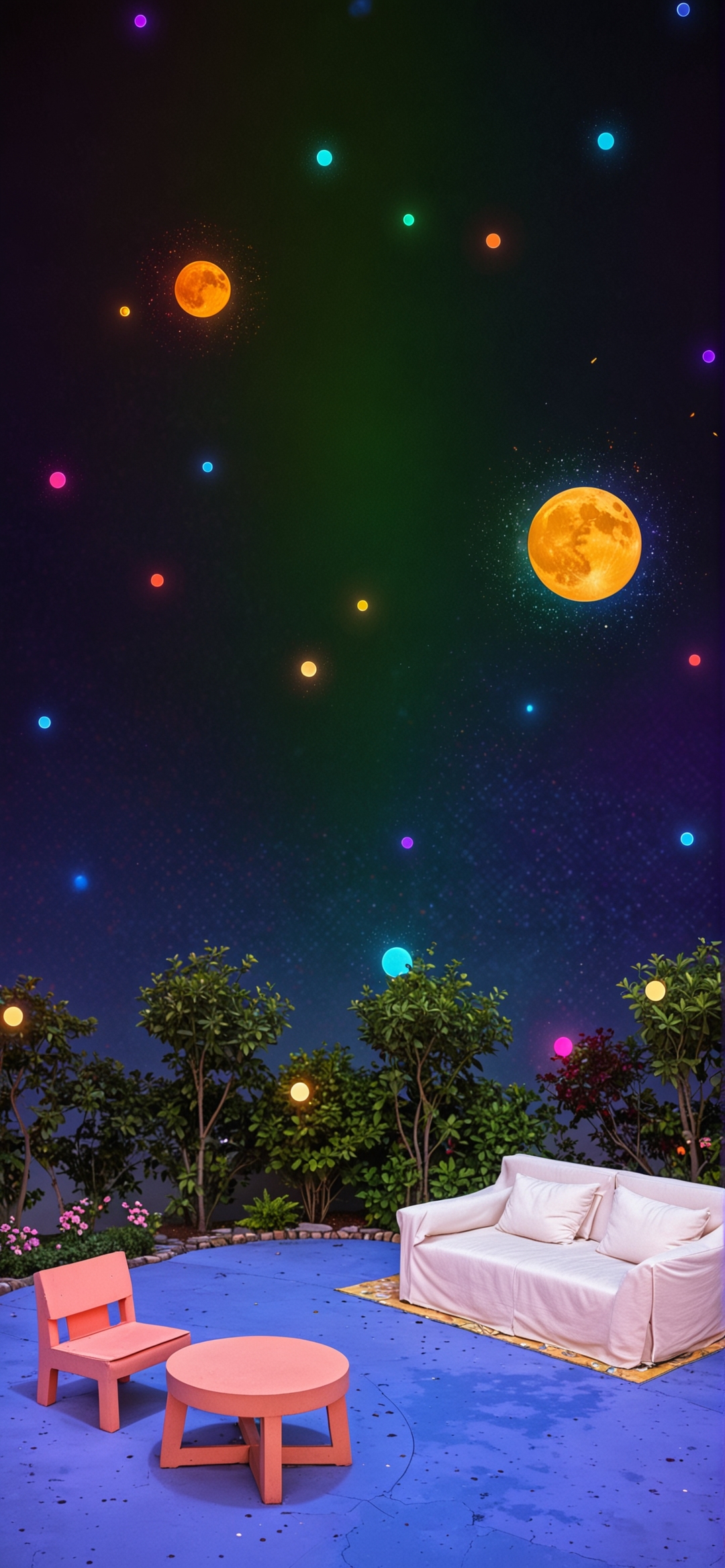 这是一个异想天开的户外场景的数字渲染图像。图片中有一张白色的沙发和一张配套的椅子,中间有一张橙色的桌子。地板是充满活力的蓝色,与背景中的绿色树叶形成对比。最引人注目的元素是夜空,布满了星星,被多个不同颜色的大型发光球体照亮,营造出一种神奇而超现实的氛围。