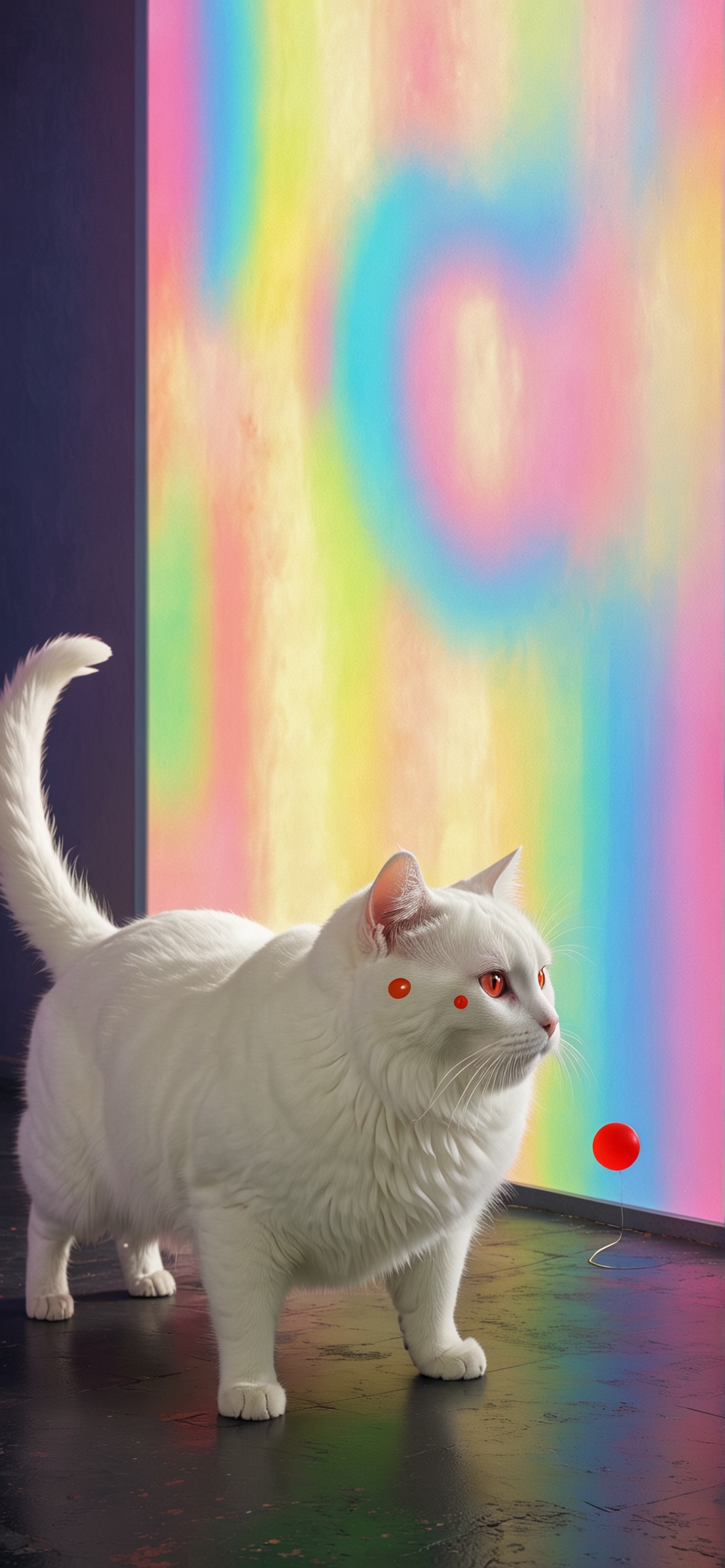 一只白猫被一个红气球迷住的渲染图像。这只猫在照片的左边,穿着纯白的外套,从侧面拍摄,它的注意力完全被盘旋在右边的气球吸引了。背景以充满活力的抽象彩虹色画布为特色,与黑暗的地板形成鲜明的视觉对比。猫对气球迷人的凝视给构图注入了一种好奇和顽皮的感觉。