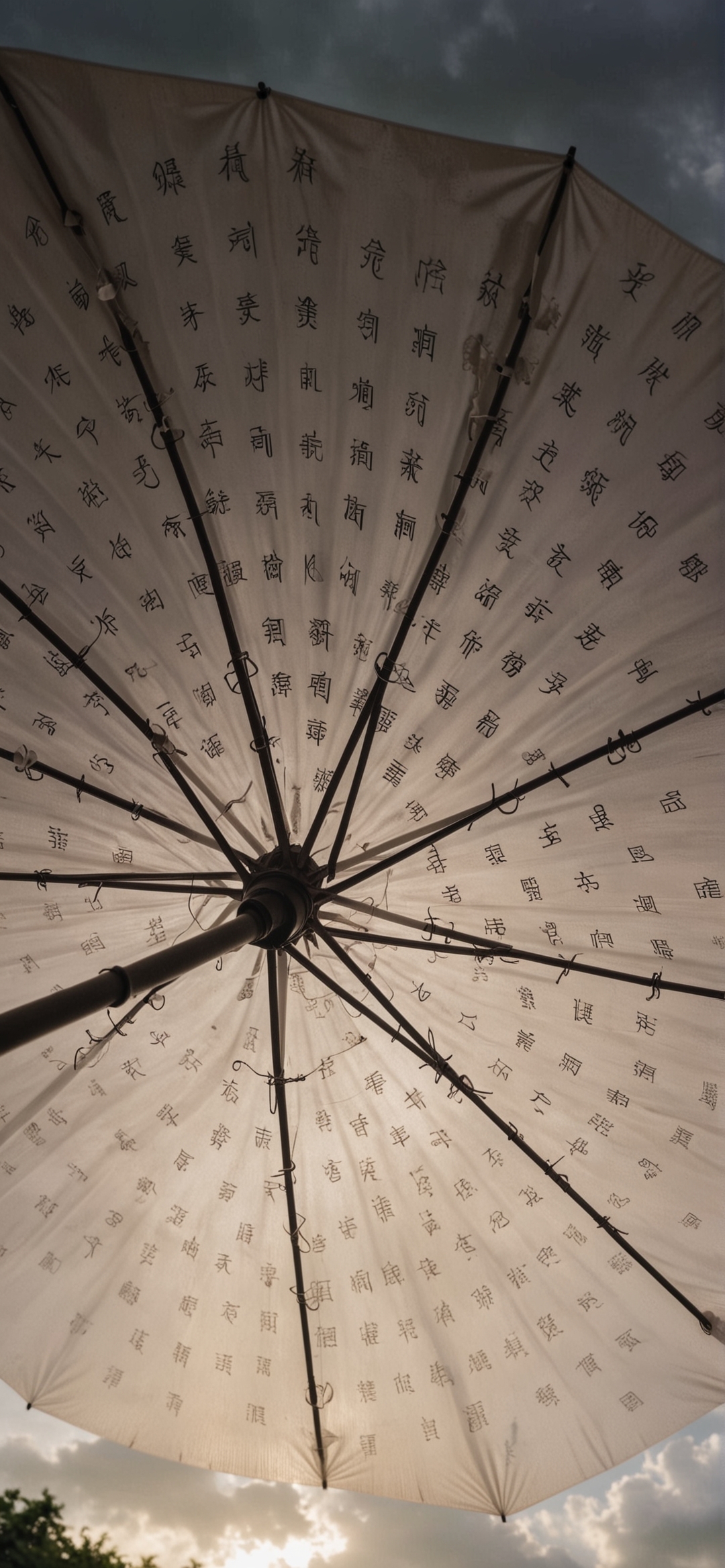 奶油色遮阳伞的底面。遮阳伞是开放的,其复杂的金属辐条框架从中心枢纽向外辐射。阳伞的每一部分都用黑色墨水写着许多汉字,像是一首诗或传统文字。背景的特点是多云天空的柔焦视图,太阳光线照亮遮阳伞的边缘,创造出一种温柔,空灵的光芒。图像的构图和照明唤起了一种宁静和文化丰富的感觉。