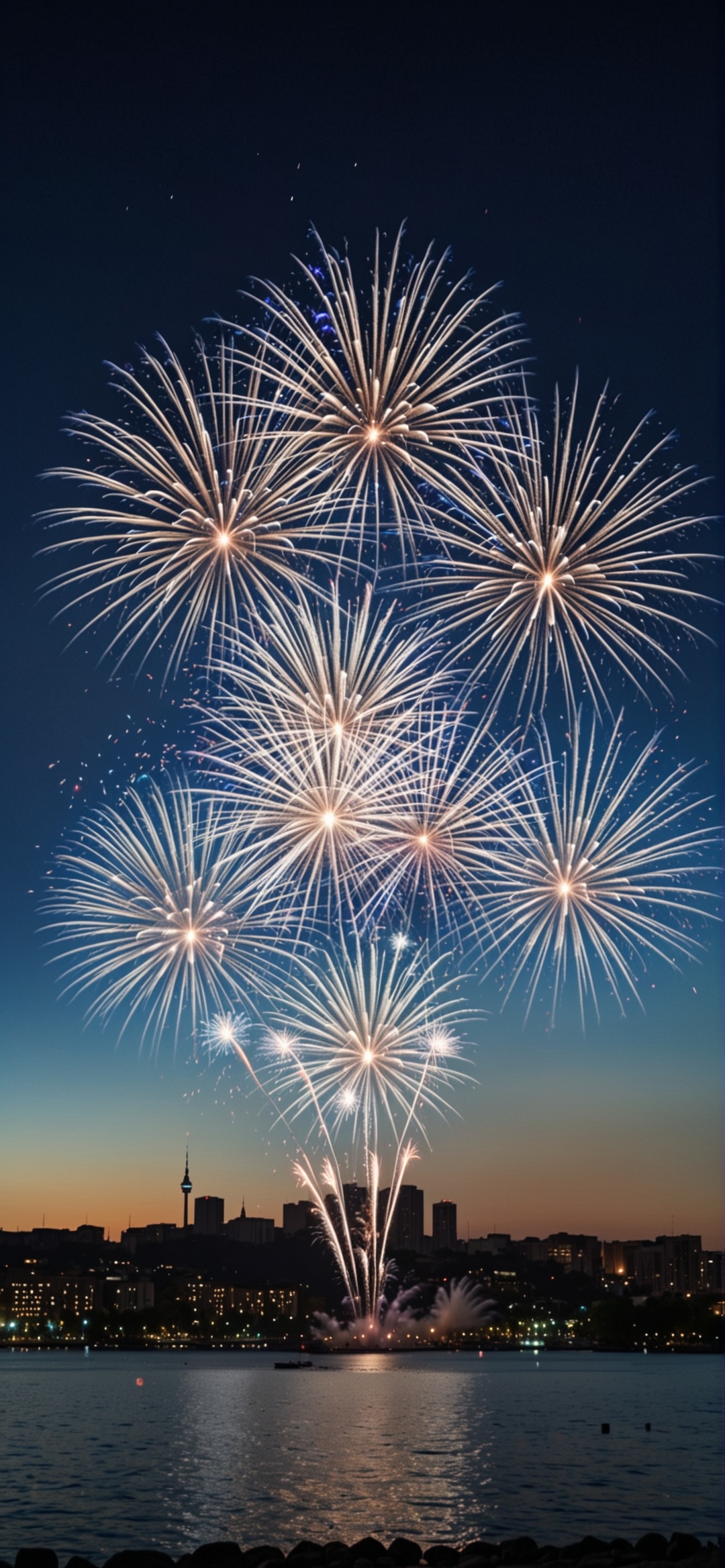 城市天际线上令人眼花缭乱的烟花表演的照片。这张照片是从水面上拍摄的,城市的灯光反射在水面上。烟花在白色和金色的交响乐中爆炸,照亮了暮色的天空。傍晚天空的暗蓝色为璀璨的烟花提供了引人注目的背景。在地平线上可以看到一群建筑物,它们的剪影映衬着色彩斑斓的天空。整体构图令人着迷,展示了烟花庆典的美丽和宏伟。
