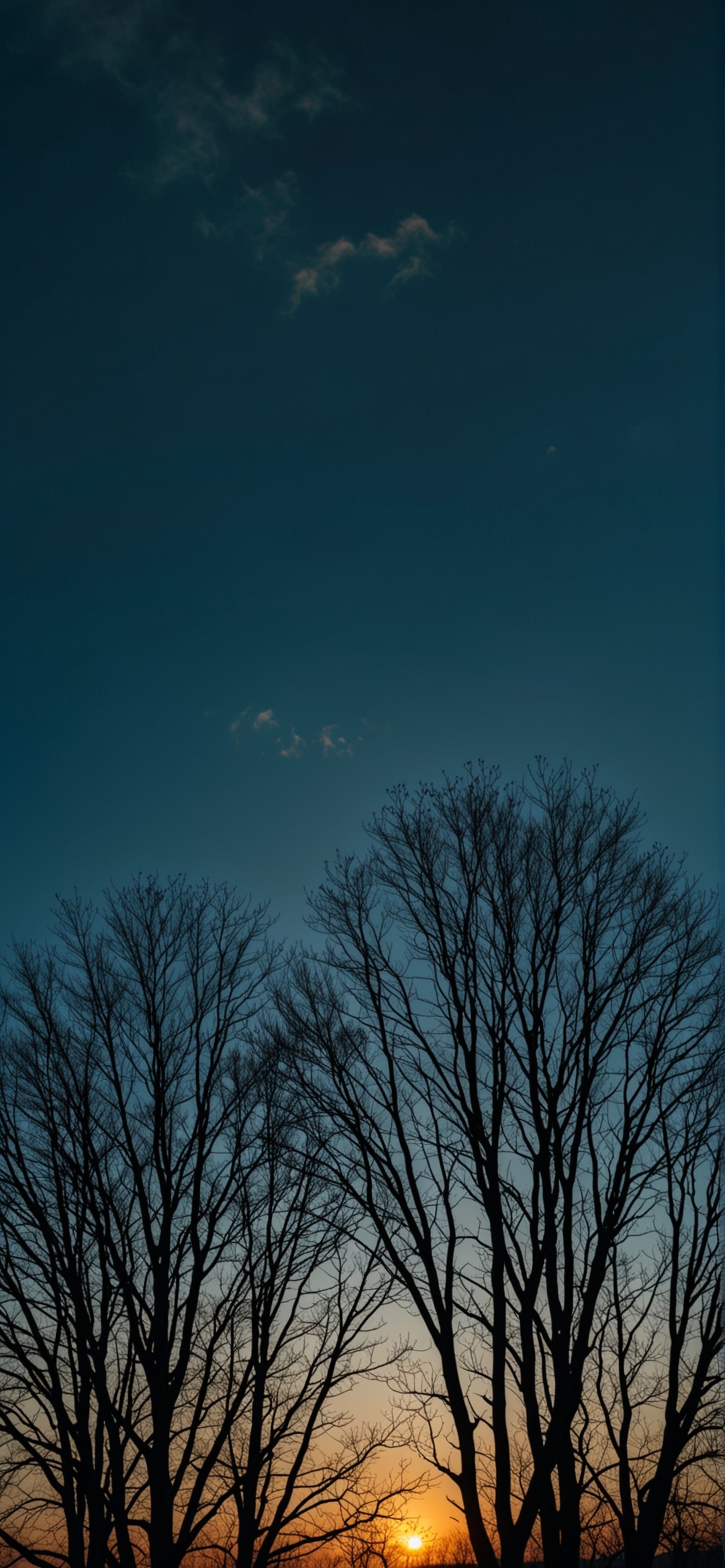 黄昏剪影:裸树轮廓框映夕阳下的深蓝天际