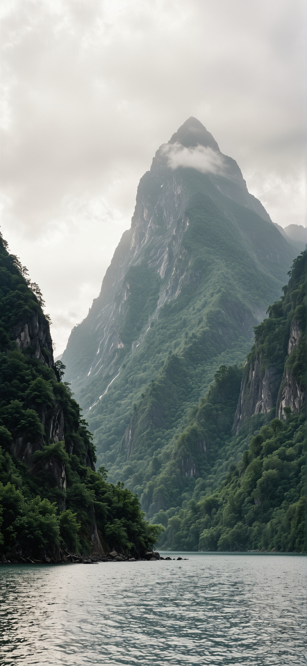 一座雄伟的山峰高耸在宁静的湖泊之上,山坡上覆盖着生机勃勃的绿叶。山顶部分笼罩在薄雾中,给景色增添了一种神秘的气氛。前景中的水很平静,反映了天空和周围的绿色植物。陡峭的,树木覆盖的悬崖两侧的湖,创造了封闭和宏伟的感觉。这张照片的整体氛围是平静而令人敬畏的,捕捉到了自然的原始之美。