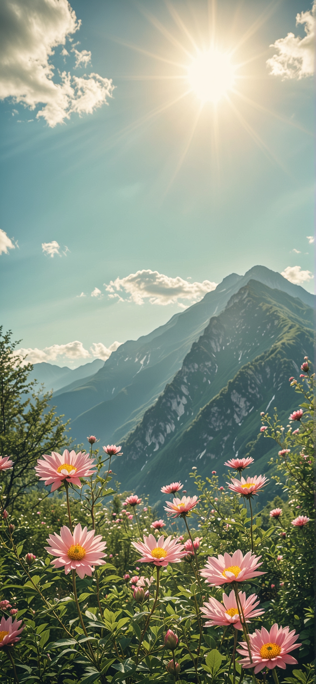 阳光照耀的山间草地的照片。淡粉色的雏菊被明亮的太阳照在浅蓝色的天空中,填满了照片的前景。背景是一片翠绿、阳光普照的山腰伸向多云的蓝天。这张照片有一种柔和、温暖的光线,笼罩着整个场景。