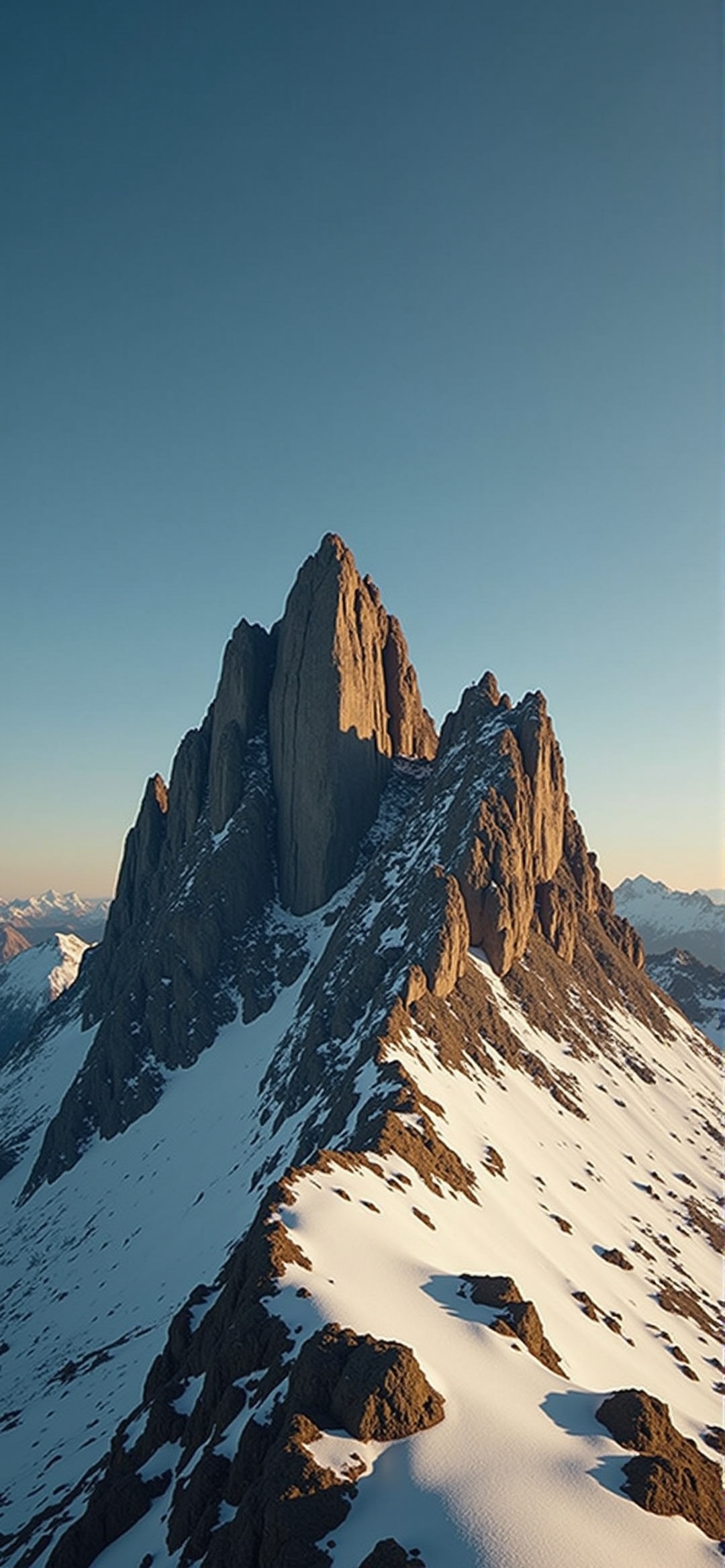 白雪覆盖的山峰映衬着湛蓝的天空。山峰由几个陡峭的岩壁组成,部分被雪覆盖,在雪坡上投下长长的阴影。从上面的角度看,俯视着山峰和周围的山脉,给人一种规模和宏伟的感觉。阳光来自图片的右侧,将温暖的光线投射到山峰上,与凉爽的蓝天形成鲜明的对比。