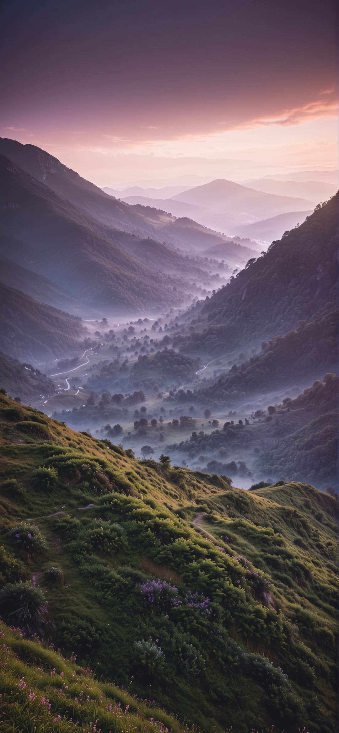 一个广阔的、青翠的山谷沐浴在柔和的、飘渺的晨光中。这张照片拍摄于一个很高的有利位置,展示了笼罩在薄雾中的起伏的丘陵和山谷的令人惊叹的全景。初升的太阳在天空中投下一种温暖的紫色,与远处山脉的冷蓝色形成鲜明对比。一条蜿蜒的道路蜿蜒穿过谷底,消失在清晨的薄雾中。前景郁郁葱葱的绿色山坡上点缀着野花,为宁静的风景增添了一抹生机勃勃的色彩。这幅构图将观众的目光吸引到蜿蜒的道路上,引导他们深入到风景如画的景色中。