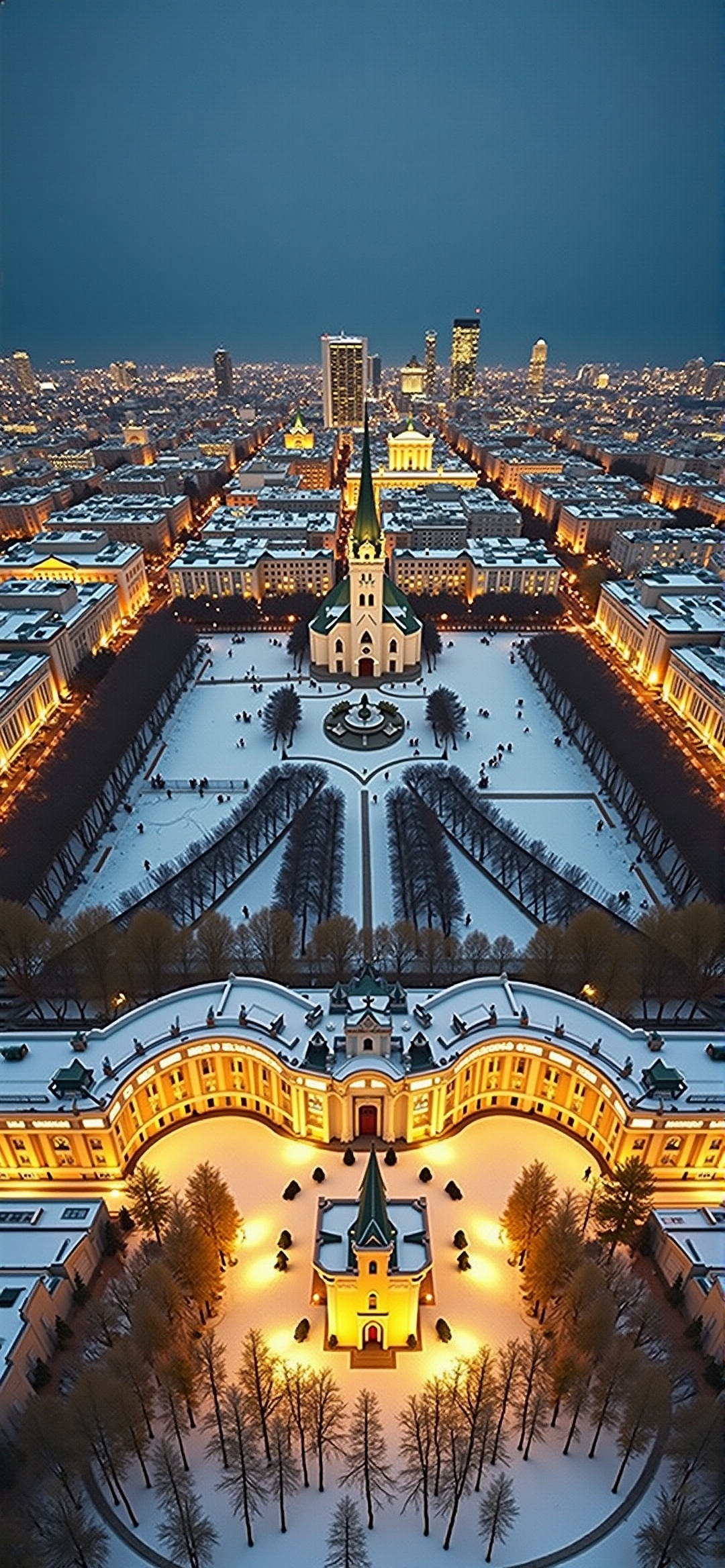黄昏时白雪覆盖的城市鸟瞰图。图像被分成两个不同的部分。上半部分展示的是城市景观,有灯火通明的建筑,一个突出的教堂,中间有一个高高的尖塔,还有一个庞大的街道网络。下半部分的特写是一座宏伟的、弯曲的建筑,建筑结构复杂,庭院里有一个较小的教堂。两个部分由中轴线连接,强调了建筑的对称性和宏伟。白雪覆盖的地面和光秃秃的树木给景色增添了一丝冬日的宁静。