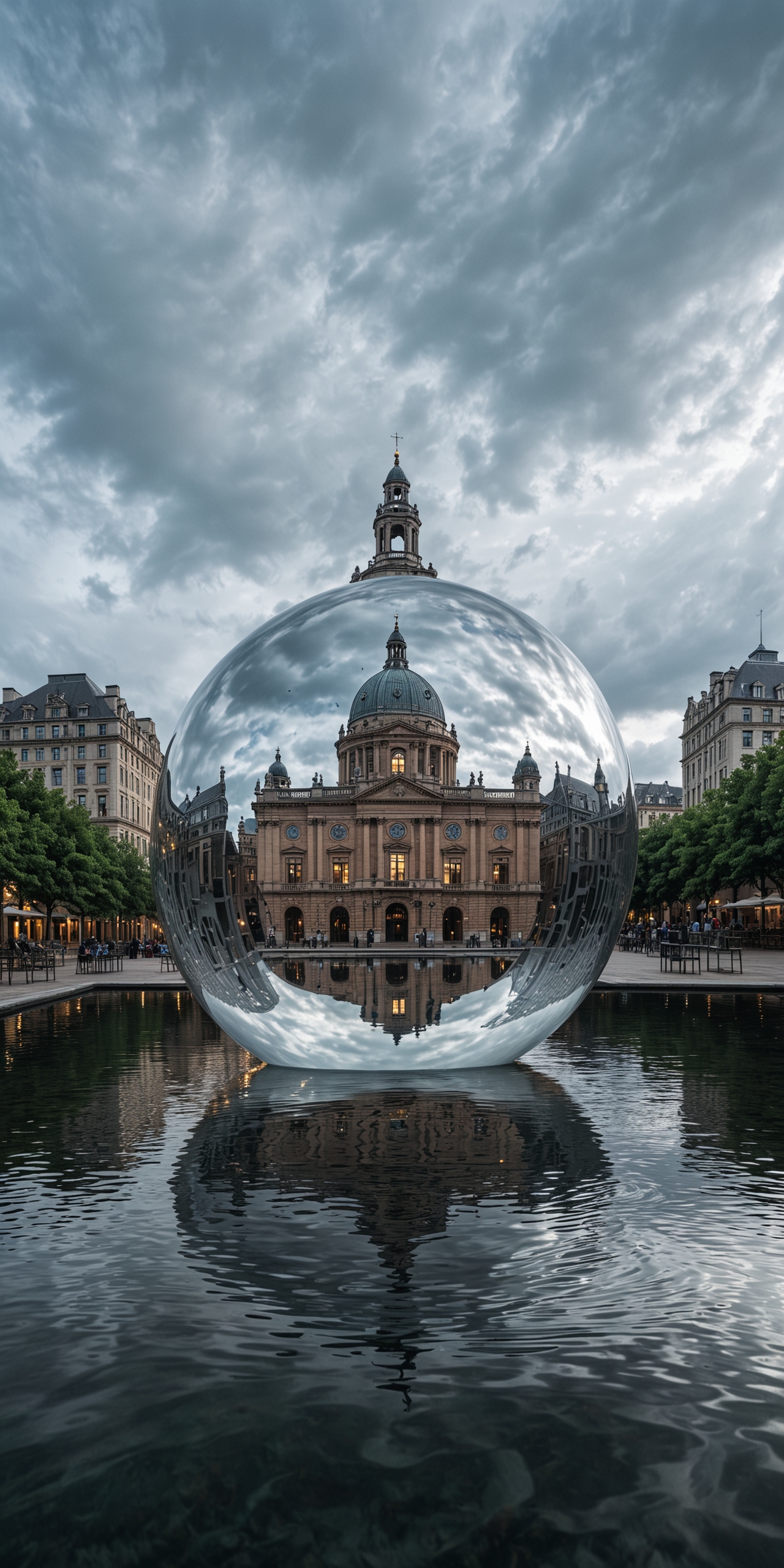 一个巨大的反射球体艺术装置,坐落在一座庄严的圆顶建筑前。这张照片是从一个低角度拍摄的,强调了球体的大小和反射率,因为它扭曲了它背后建筑的形象。反射完美地捕捉了建筑立面的建筑细节,包括拱形窗户和华丽的钟楼。周围的广场是铺好的,背景中有漫步的人,让人联想到城市的环境。阴天的凉爽、柔和的色调和建筑的石雕营造出一种宏伟和永恒的感觉。