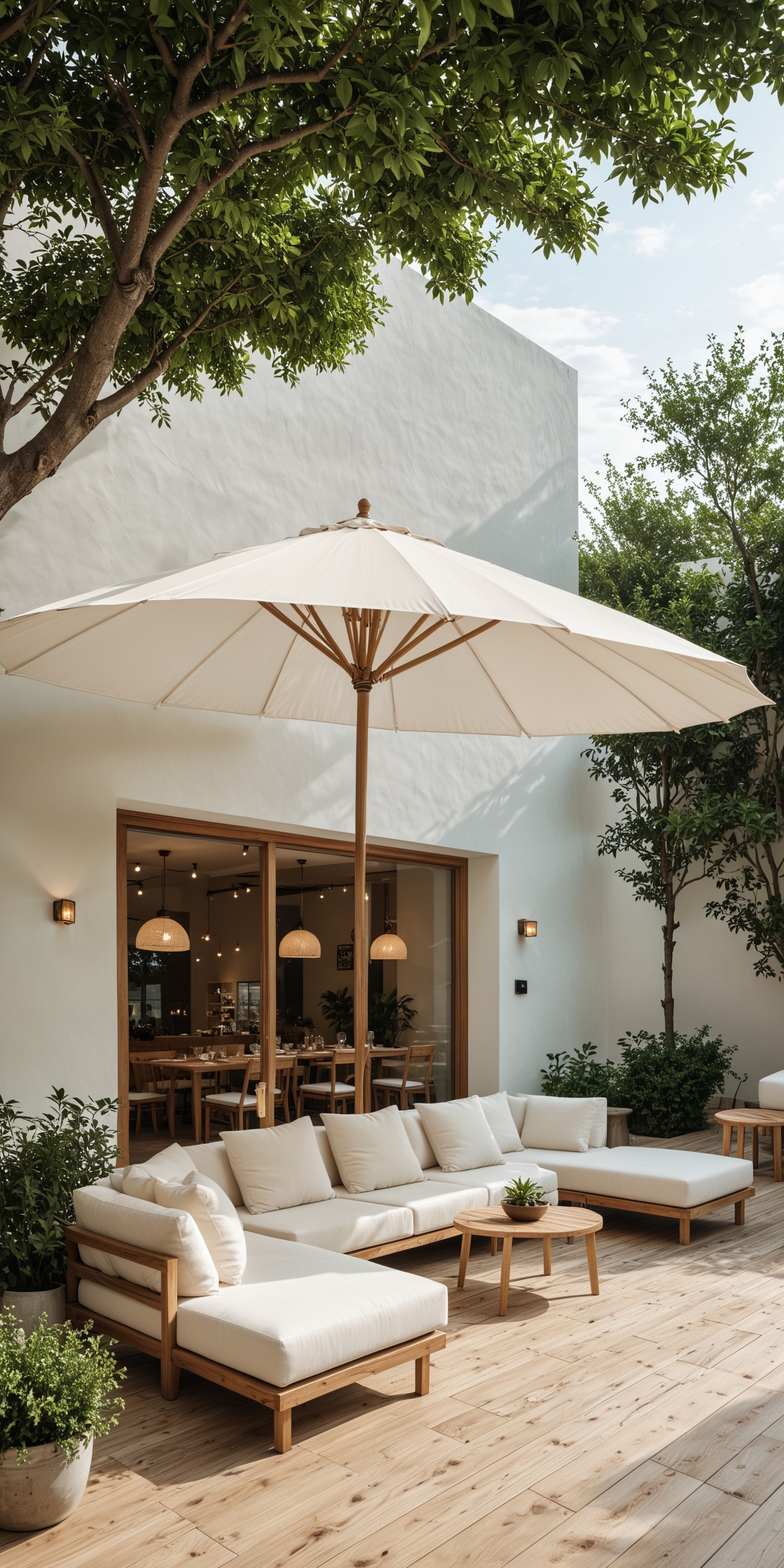 宁静而诱人的户外庭院空间的照片。一把白色的大伞为一套木质框架的白色毛绒沙发提供遮阳。沙发被布置成l形,适合放松和交谈。中间摆放着一张配套的木制咖啡桌,点缀着一株简单的植物。庭院地板采用浅棕色的木板,增添了自然和温暖的氛围。巨大的玻璃门让你一窥明亮、现代的室内,可以看到餐桌和椅子。空间以郁郁葱葱的绿色植物装饰,树木构成了图像的两侧,盆栽植物为整个空间增添了自然的气息。这张照片沐浴在温暖的阳光下,营造出一种宁静祥和的氛围。