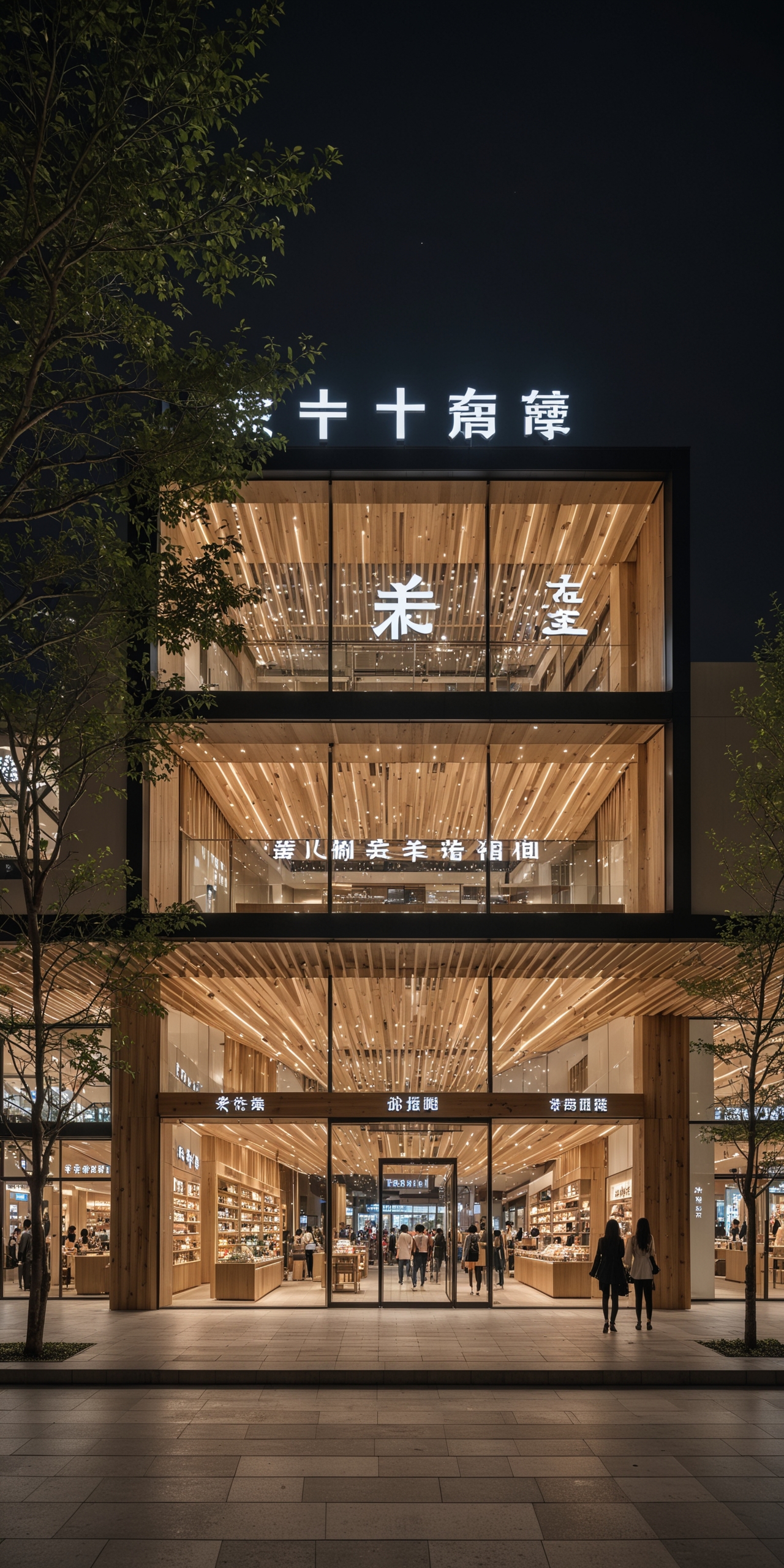 这是一座现代化的多层建筑的夜间照片,大窗户露出木质的内部。该建筑照明良好,展示了带有日文的照明标志和货架上展示的各种商品。从后面可以看到有两个人在商店前的人行道上离开了摄像头。郁郁葱葱的绿叶部分遮蔽了建筑的左侧,而一棵较小的树扎根在右侧。这张照片是从街道的角度拍摄的。温暖、诱人的灯光和简洁的建筑线条营造出现代而精致的氛围。