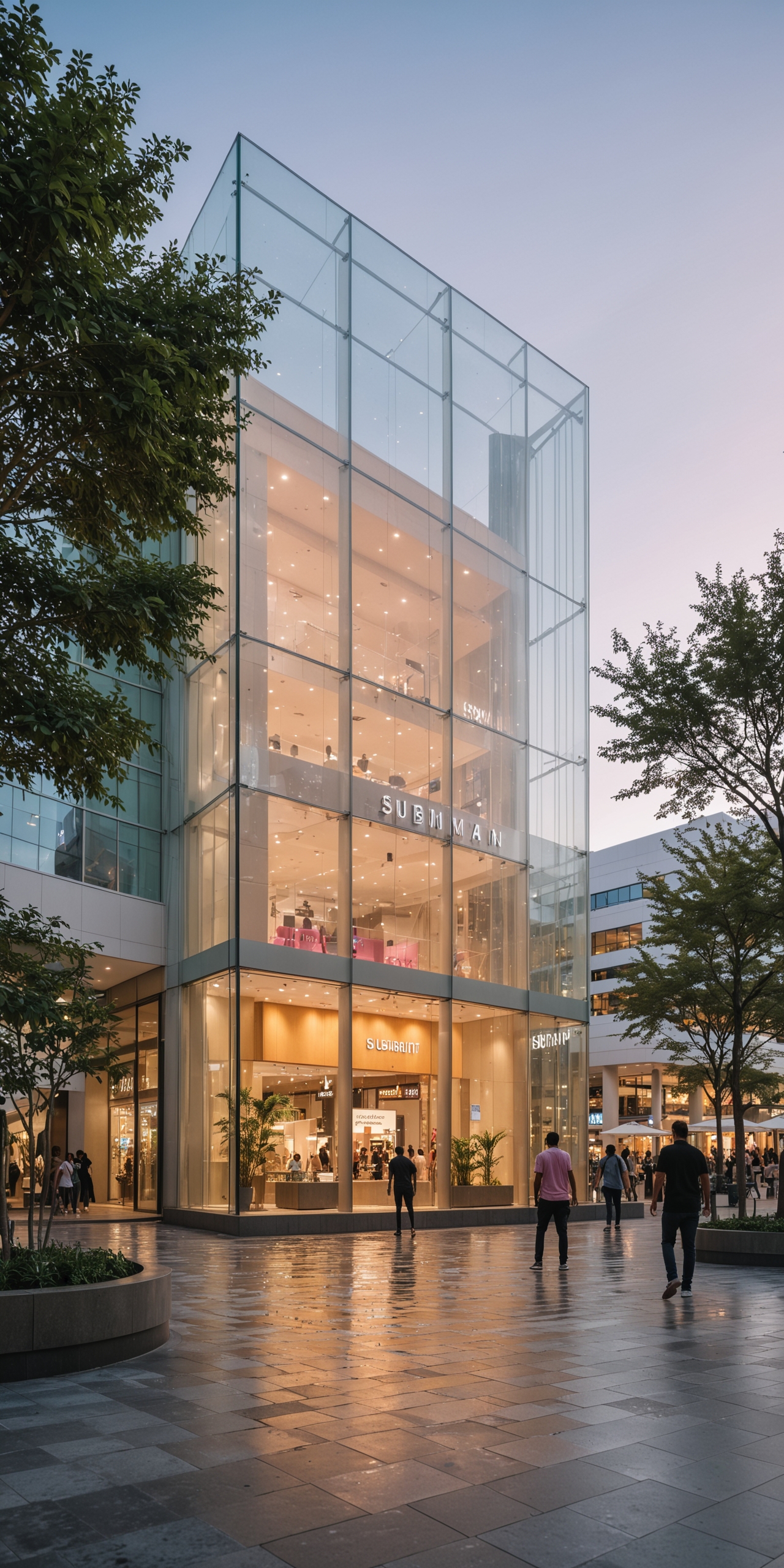 黄昏时分,城市购物区的一座现代玻璃幕墙建筑。该建筑被命名为“SUBMAIN”,有三层,通过透明的立面可以看到照明的内部。人们在大厦前铺好的广场上散步,大厦两侧是树木和其他商业建筑。商店内温暖的灯光与黄昏天空的冷色调形成鲜明对比,营造出一种诱人的氛围。这张图片是从街道的角度拍摄的,强调了建筑的规模和周围地区的繁华活动。