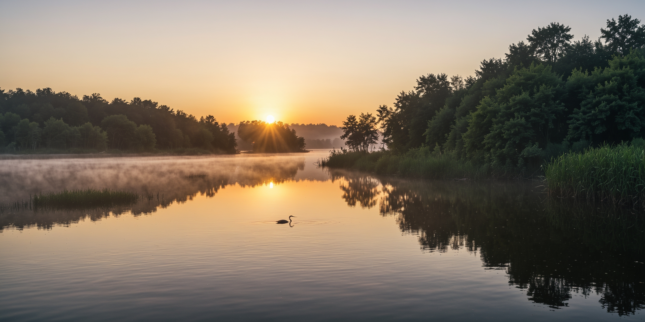 雾蒙蒙的湖面上宁静的日出。太阳从远处海岸的树影后面升起,在水面上投下金色的光芒,照亮了薄薄的一层薄雾。平静的水面反射着天空和树叶,形成了近乎完美的镜像。一只孤独的苍鹭优雅地滑翔在水面上,打破了黎明的寂静。湖的两边是郁郁葱葱的森林,它们的剪影映在平静的水面上。这幅画唤起了一种宁静和自然世界之美的感觉。