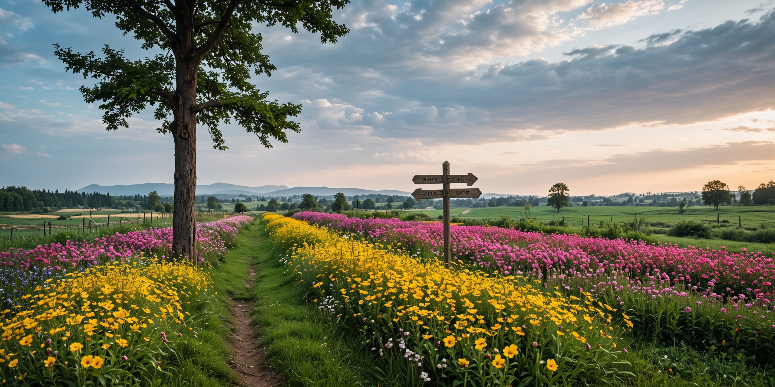日落时充满活力的野花田野。一条点缀着明黄色和粉色花朵的土路从前景一直延伸到远处,通向连绵起伏的绿色山丘和多云天空下如画般的日落。路边立着一个饱经风吹日晒的木制路标,上面用一种陌生的语言刻着方向。一棵成熟的树和深色的叶子固定在构图的左侧,为田园诗般的场景增添了一种宁静的孤独感。这幅画唤起了一种宁静的感觉和冒险的希望。