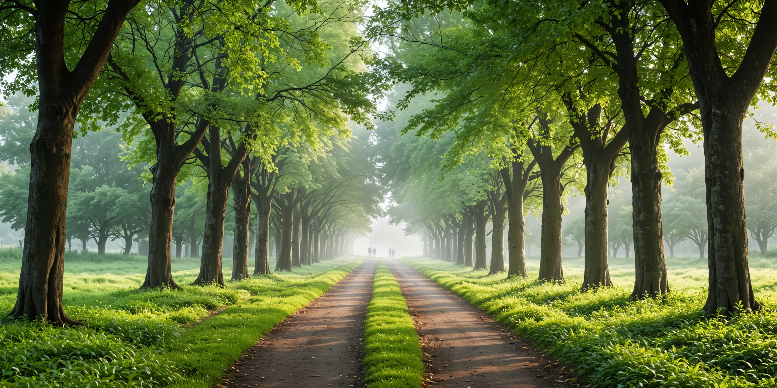 晨雾笼罩的林荫道的照片。两排高大的、全叶的树木排列在一条宽阔的土路上,消失在远处。清晨的阳光从后面穿过树林,在小路上投下长长的影子,照亮了薄雾。小路两旁鲜绿的草地上点缀着阴影。在远处,有三个人沿着小路朝灯光走去,他们的身影几乎完全被雾和远方遮住了。