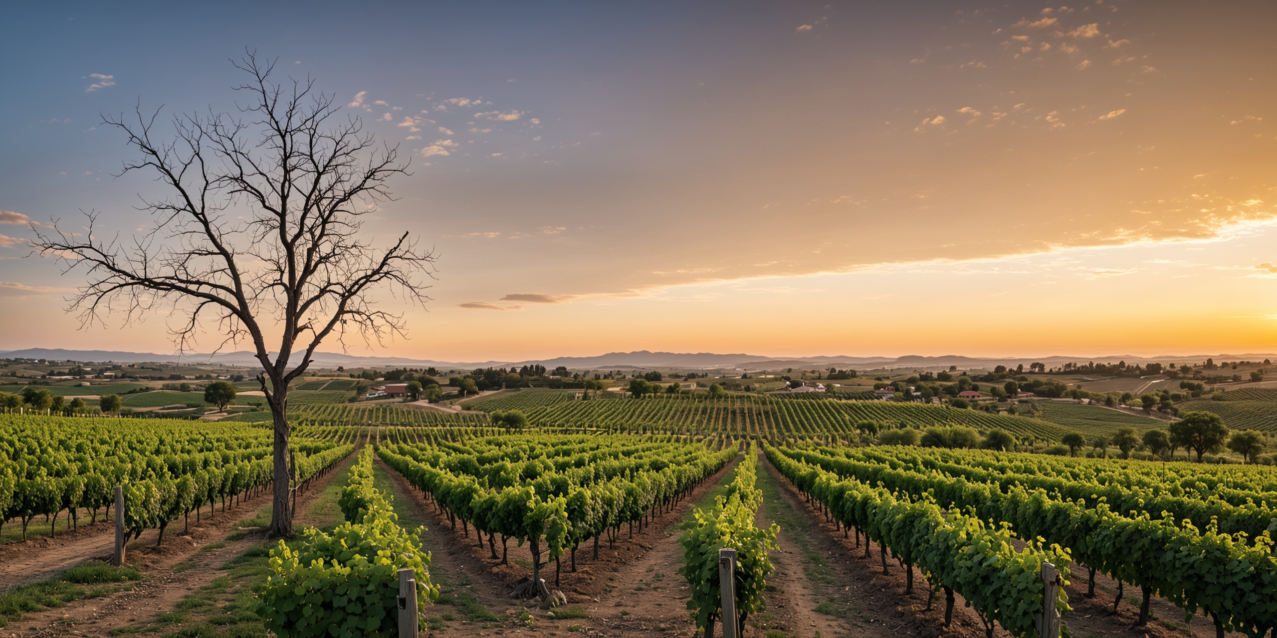夕阳下葡萄园的照片。这张照片是从一个低角度拍摄的,俯瞰着一排排郁郁葱葱的绿色葡萄藤。一棵孤零零的光秃秃的树矗立在前景中,映衬着夕阳的暖色调。葡萄园一直延伸到远处,在那里遇到连绵起伏的山丘和散落的房屋和树木。天空是橙色、粉色和蓝色的混合,柔和的云增添了宁静的气氛。整体印象是宁静和自然之美,捕捉了宁静乡村景观的精髓。