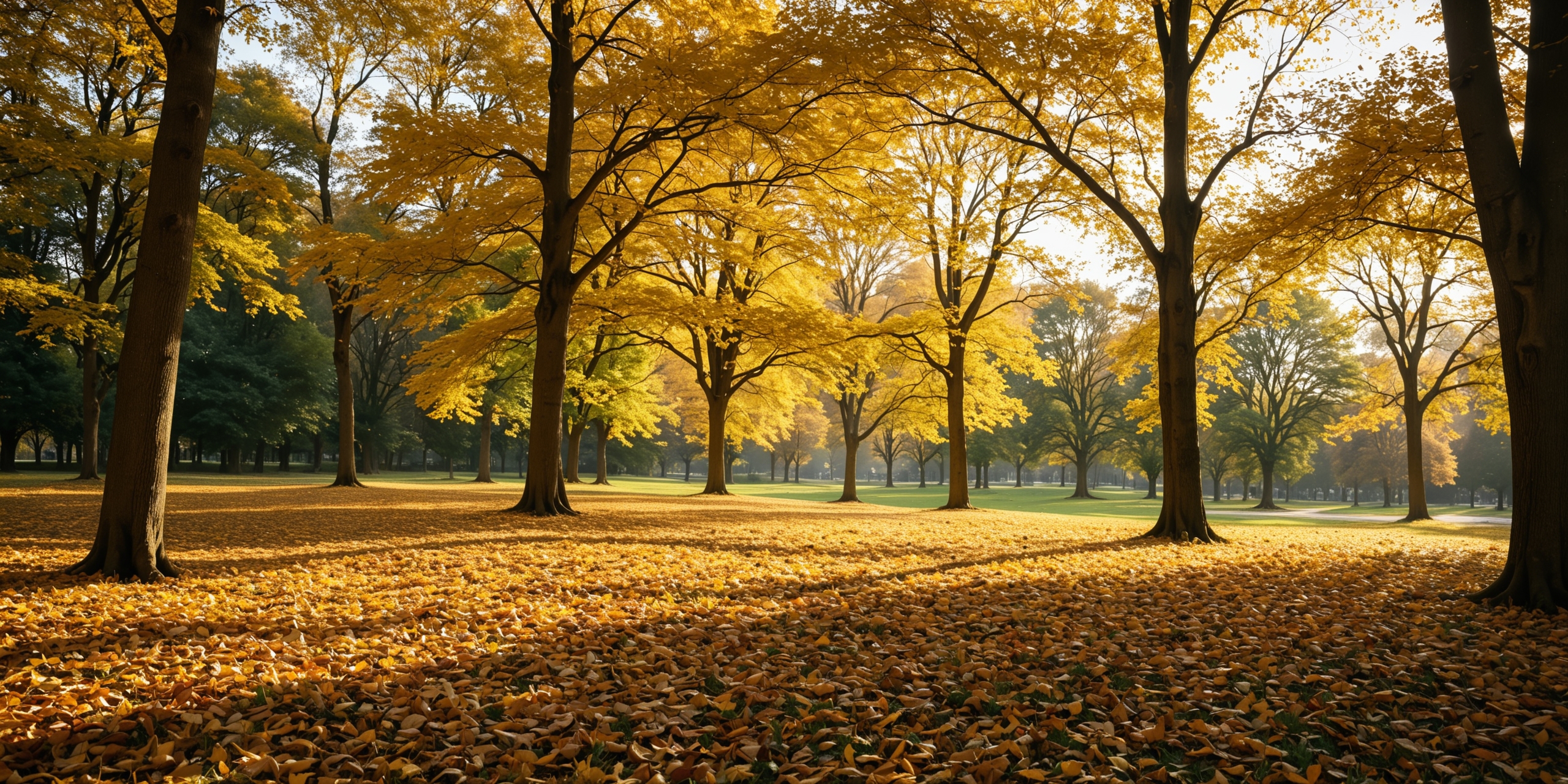 一个宁静的秋天公园的照片。这张照片是从一个低角度拍摄的,突出了参天大树的枝干伸向天空。树叶被清晨温暖的阳光照亮,呈现出鲜艳的金黄色,在地面上投下长长的阴影。地上铺着一层厚厚的落叶。整体氛围是一种宁静和美丽,捕捉秋天的精髓。图像清晰,构图良好,清晰地关注树叶的细节和光影的发挥。