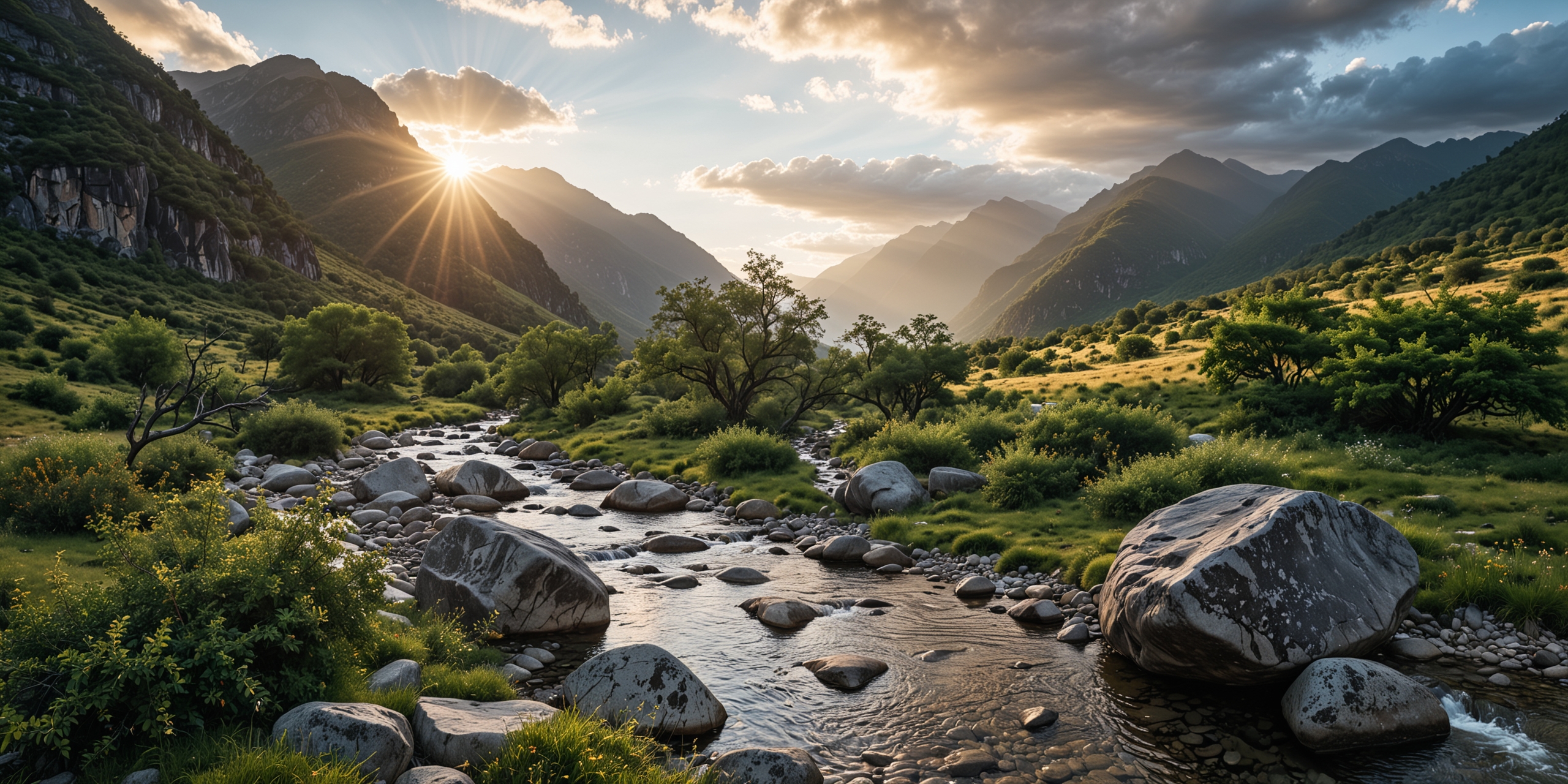 日落时风景如画的山谷照片。一条清澈浅浅的河流,点缀着巨石,蜿蜒穿过画面的中心。夕阳落在左边的山后,在整个场景中投射出温暖的金色光芒,形成了星爆的效果。郁郁葱葱的绿色植被覆盖了山坡和河岸,而蓬松的云点缀着彩色的天空。这幅画唤起了一种宁静的感觉和令人敬畏的自然之美。
