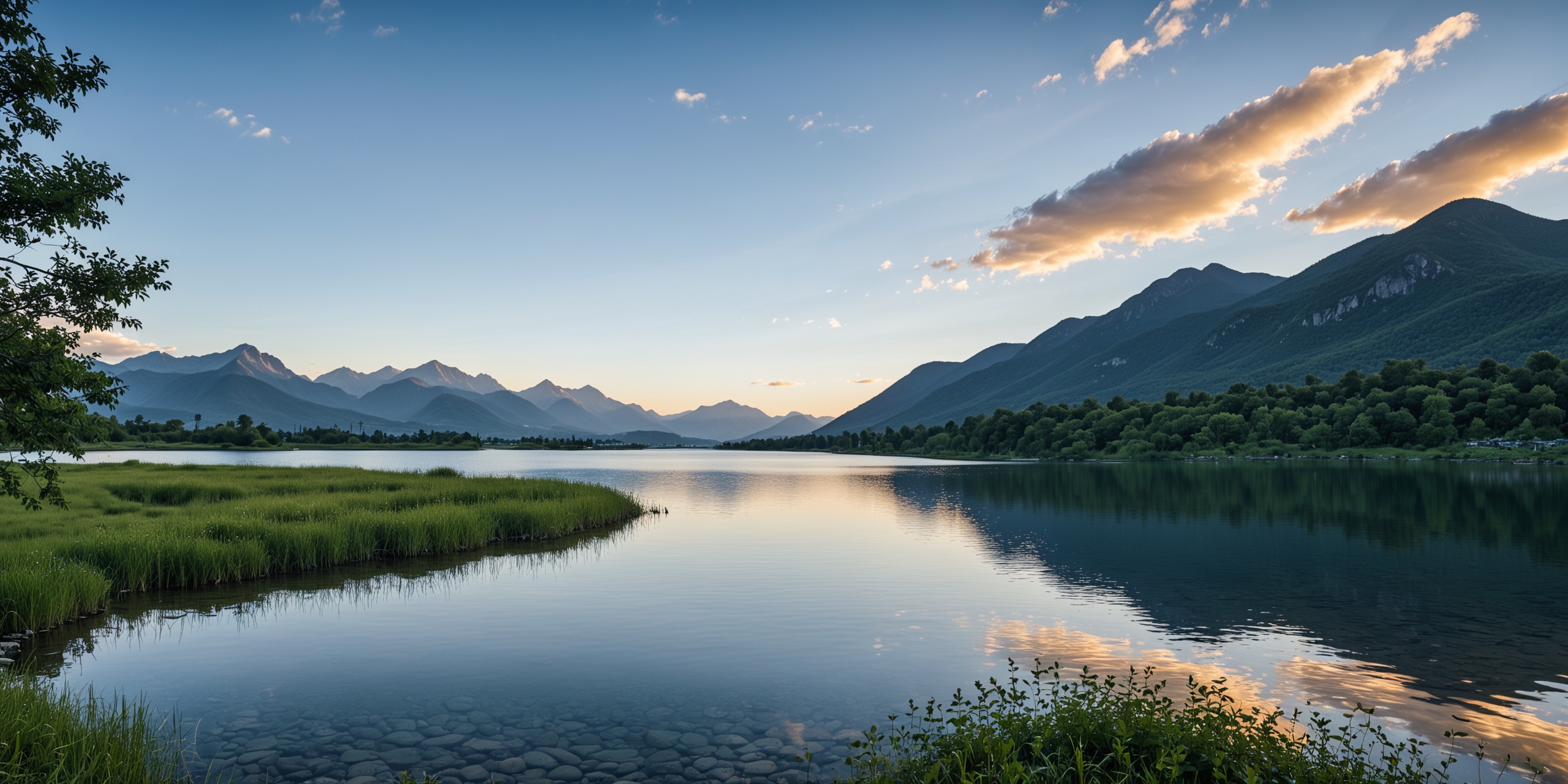 这是一张坐落在风景如画的山脉中的宁静湖泊的照片。湖面反射出蔚蓝的天空和夕阳的金色色调,创造出镜子般的效果。水面平静而清澈,水面上几乎没有涟漪。郁郁葱葱的绿色植被排列在湖岸,而高耸的山脉提供了一个戏剧性的背景。天空是清澈的蓝色,柔和的缕缕云被夕阳染成粉红色和橙色。这幅画唤起了一种和平与安宁的感觉,捕捉了黄昏时的自然之美。