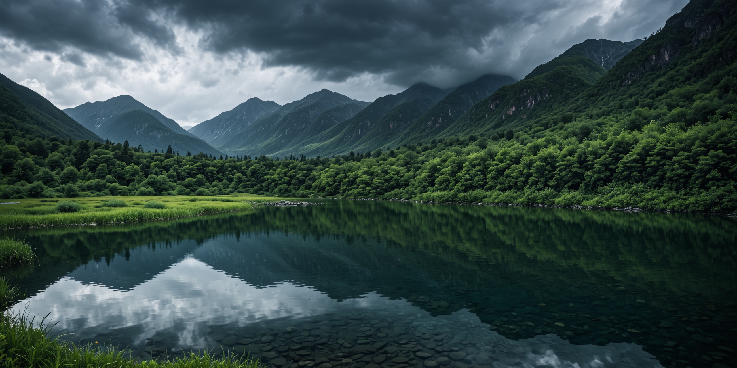 一个宁静的山间湖泊反射着上面戏剧性的天空。平静的湖水完美地映衬着高耸的山峰,山坡上覆盖着郁郁葱葱的绿色植被。郁郁葱葱的森林环绕着湖岸,营造出一种宁静、与世隔绝的感觉。头顶上,乌云密布的暴风雨天空为这一场景增添了戏剧性,暗示着大自然的力量。这张照片可能是用广角镜头拍摄的,捕捉到了广阔的风景和自然世界的宁静之美。