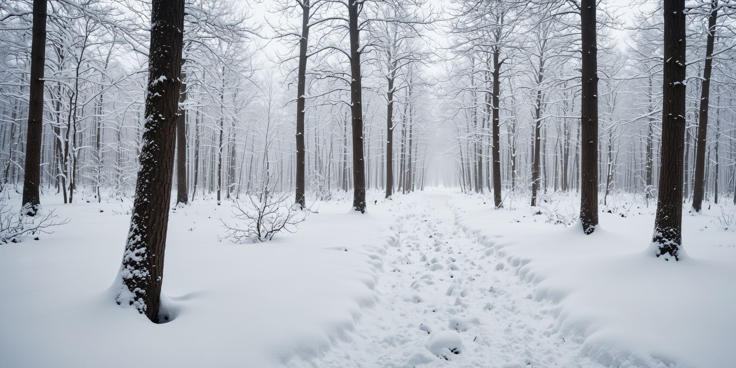 冬天,一条被雪覆盖的小路穿过茂密的森林。小径上有脚印,从前景延伸到远处,消失在树林中。光秃秃的树枝上挂满了雪,树木高高耸立在两边,深色的树干与覆盖在地面上的洁白白雪形成鲜明对比。森林的地面大部分是平坦的,覆盖着一层厚厚的未受干扰的雪。这张照片是在视线水平拍摄的,营造出一种沉浸感和宁静感。整体色调是冷而柔和的,唤起了冬季森林的寂静和宁静。