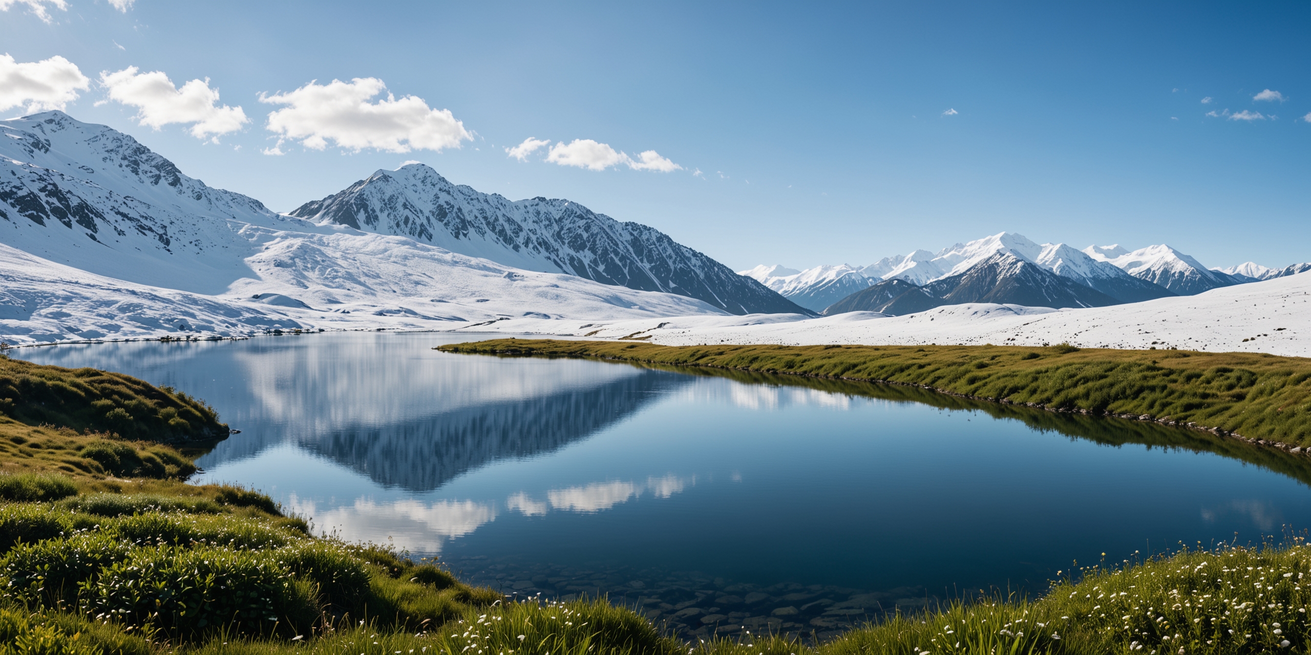 一张宁静的高山湖泊的照片,反射着白雪皑皑的山脉和清澈的蓝天。宁静而原始的湖泊横跨画面中央,湖面映衬着周围的山峰和几朵蓬松的云。葱郁的绿草和散落的白色野花排列在水边,过渡到积雪覆盖的低山坡上。山脉本身,参差不齐,气势雄伟,在背景中,他们的雪峰捕捉阳光。景色宁静而如画,展现了大自然奇观的原始之美。