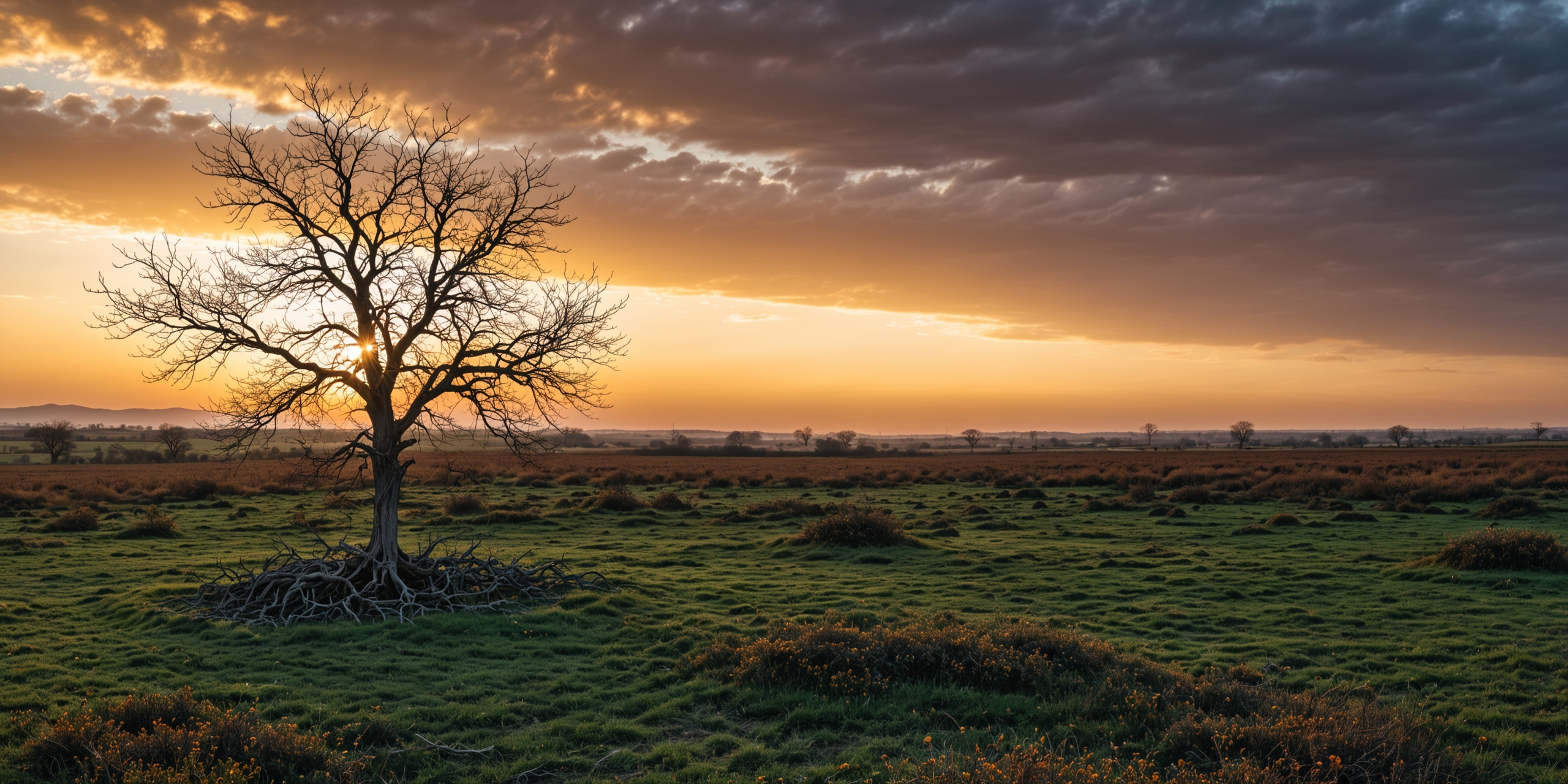 日出时田野里一棵孤零零的光秃秃的树的照片。这棵树位于中心偏左的位置,其底部有一个裸露的树根网络。冉冉升起的太阳在背景的云层上投射出温暖的橙色光芒,与上方较暗的云层形成了鲜明的对比。前景是一片生机勃勃的绿草地,点缀着黄色的小花。从远处看,平坦的景观一直延伸到地平线,零星可见几棵树。画面的整体氛围是一种宁静的美和孤独。