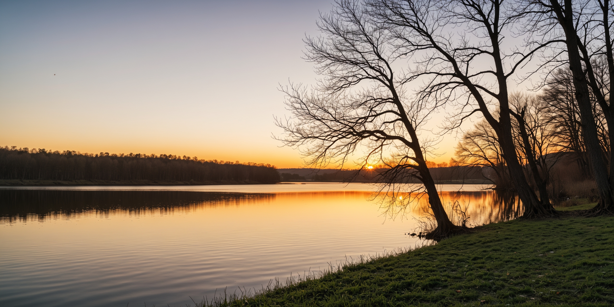 宁静的湖面上落日的照片。夕阳在平静的水面上投下温暖的金色光芒,形成了树木和天空的美丽倒影。近岸光秃秃的树枝映衬着充满活力的天空,它们错综复杂的图案给景色增添了一种宁静的感觉。前景的草地将观众的目光引向波光粼粼的水面和远处的海岸线,在那里,一排树木延伸到地平线上。色彩温暖诱人,捕捉黄昏的宁静。