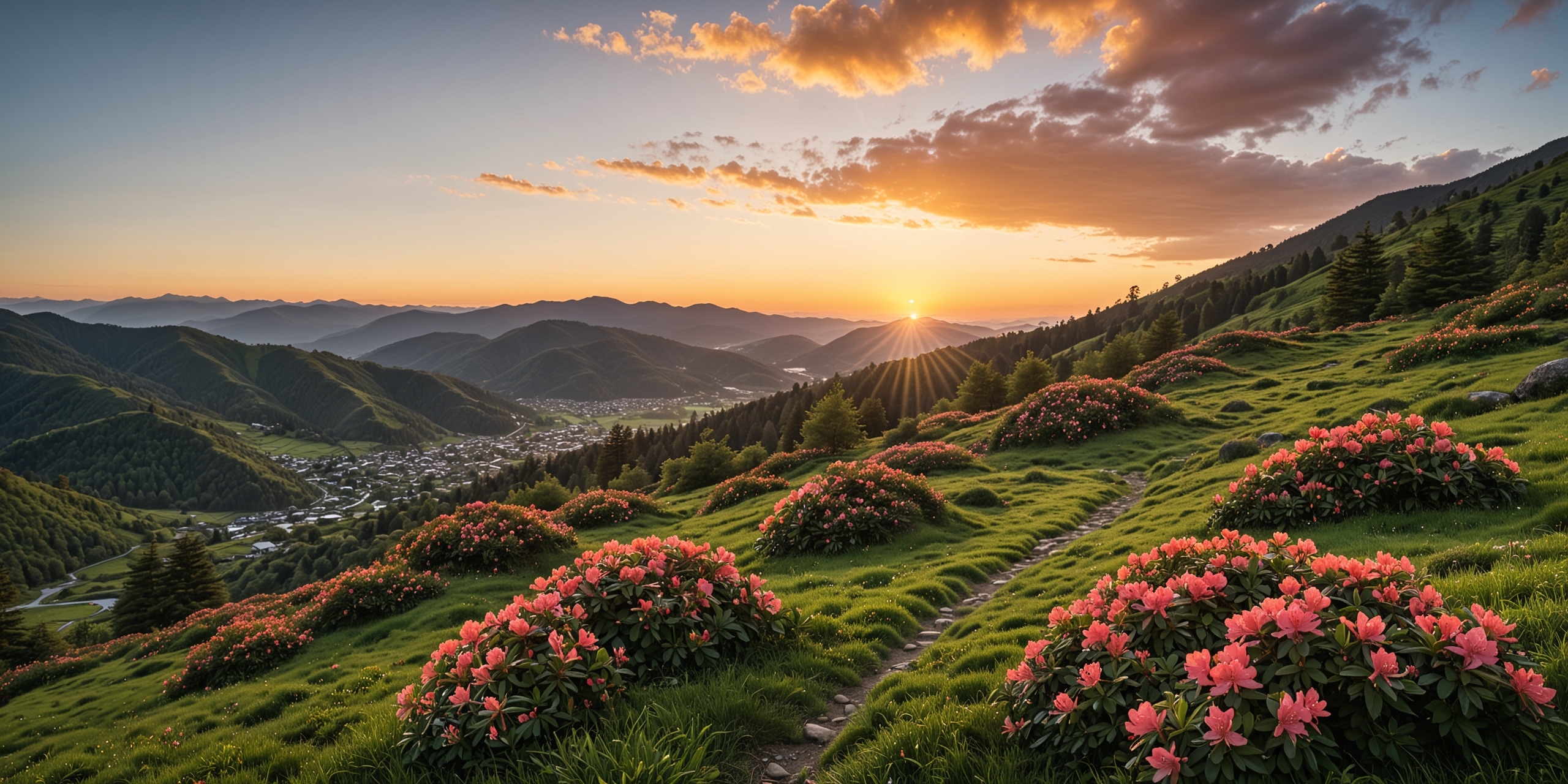 从山坡上拍摄的山谷中令人惊叹的日落照片。夕阳把景色沐浴在温暖的金色光芒中,在起伏的山丘和山谷里的一个小村庄投下长长的阴影。一条蜿蜒的小路,两旁是盛开的粉红色杜鹃花丛,引导着观众的眼睛穿过郁郁葱葱的绿色草地,走向远处的群山。这幅画唤起了一种宁静的感觉和大自然的美景。