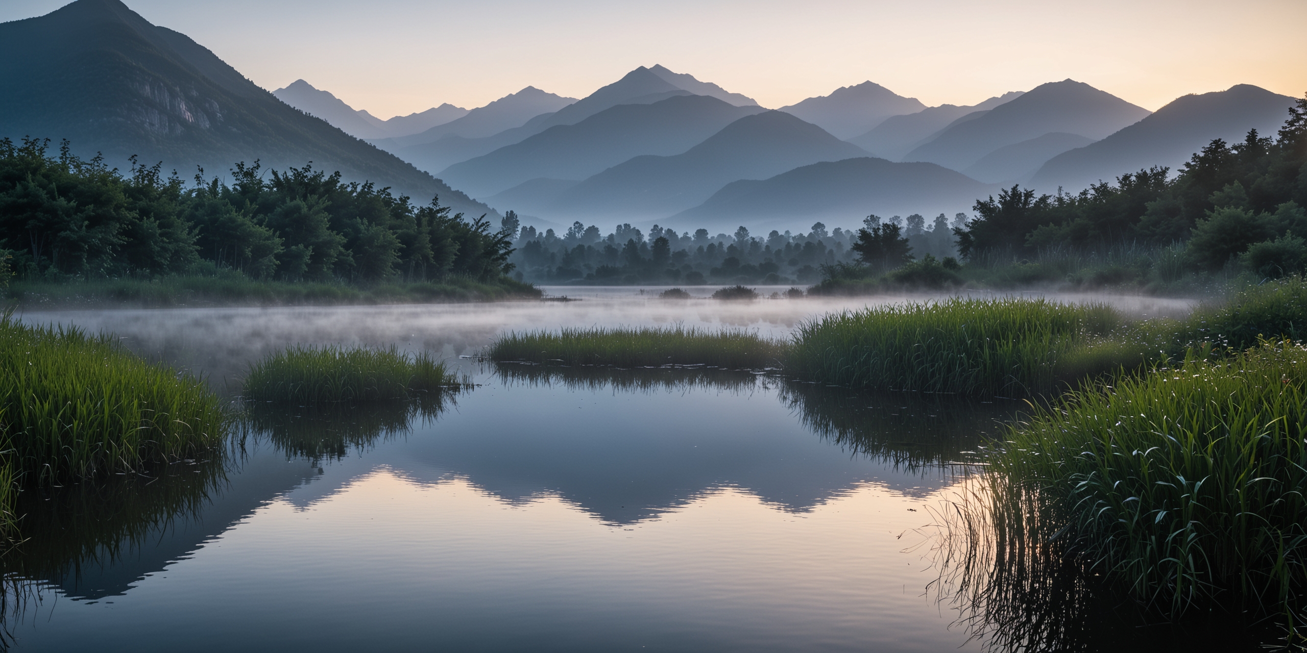 黎明时分一个宁静的山间湖泊的照片。这张照片是从一个较低的有利位置拍摄的,提供了平静的湖水全景,它的表面被从表面升起的薄雾轻轻地搅动。前景主要是郁郁葱葱的绿色芦苇从水中浮出,而背景则展示了山脉的壮丽景色,呈现出蓝色和紫色的剪影和色调,山峰逐渐消失在黄昏天空的柔和柔和的颜色中。图像的整体构图唤起了宁静和自然觉醒的美。