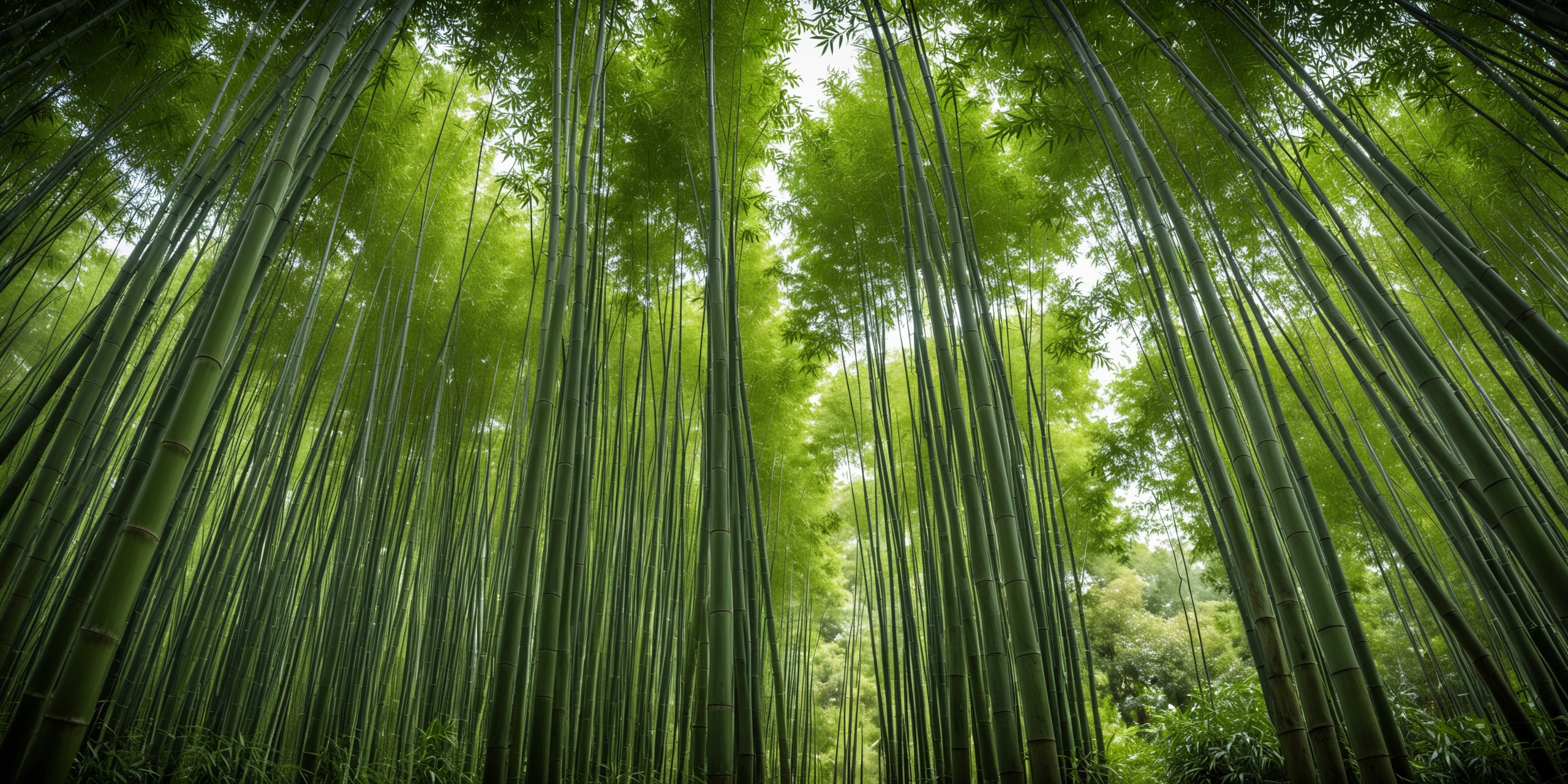 从低角度拍摄的茂密竹林照片。这张照片展示了许多又高又直的竹竿伸向天空,在茂密的树冠的背景下形成了一个迷人的图案。主要的颜色是充满活力的绿色,反映了植被的繁茂。画面散发出一种宁静和宁静的感觉,突出了竹林的自然美和垂直感。