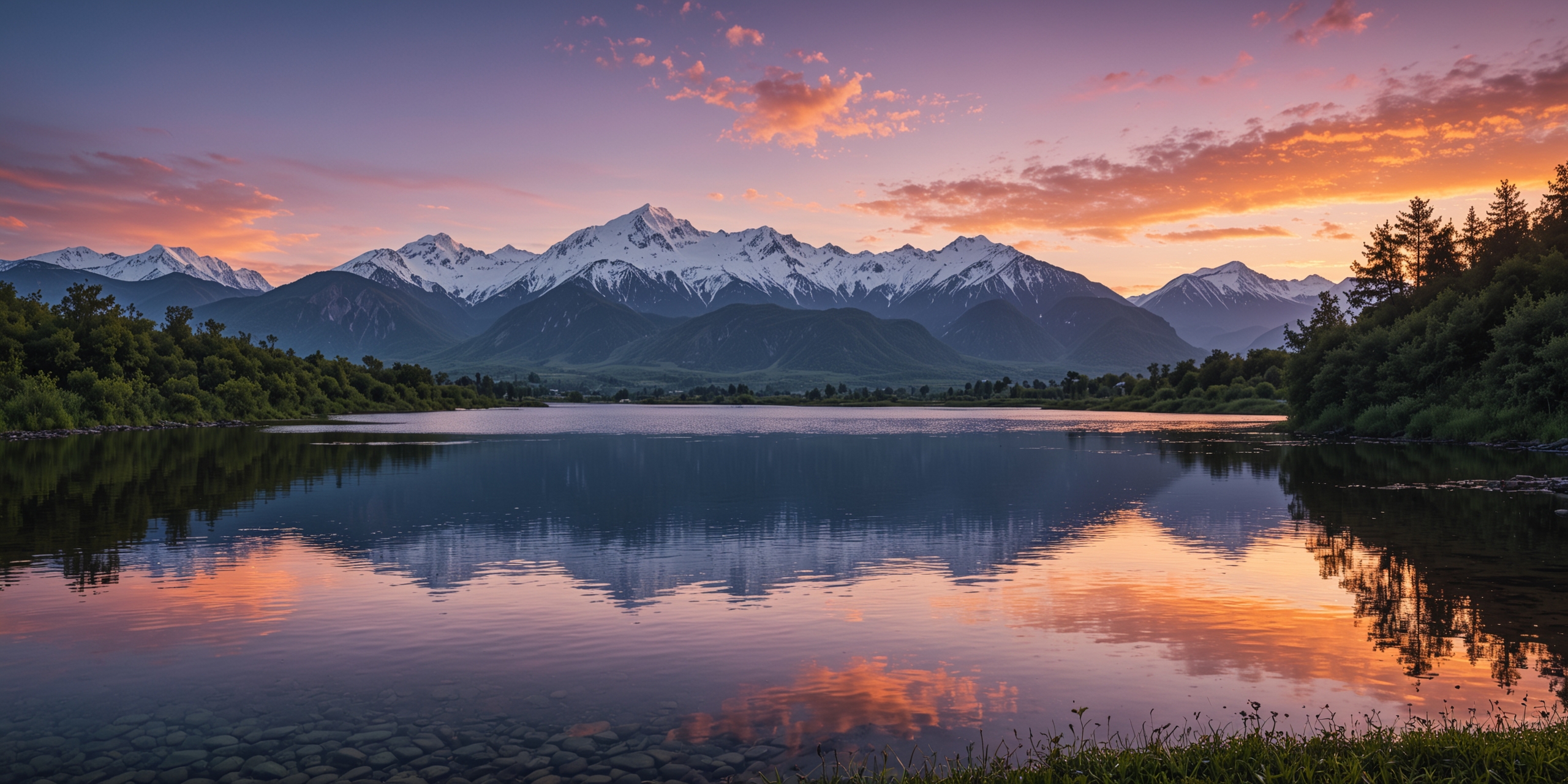 日落时,宁静的山间湖泊的照片。白雪覆盖的山峰占据了背景,在平静的湖水中完美地反映出来。夕阳的余晖使天空呈现出桔黄色、粉红色和紫色的鲜艳色彩。郁郁葱葱的绿色植被环绕着湖的边缘,在前景中可以清晰地看到岩石底部。这幅画的构图很好,给人一种宁静和自然美的感觉。