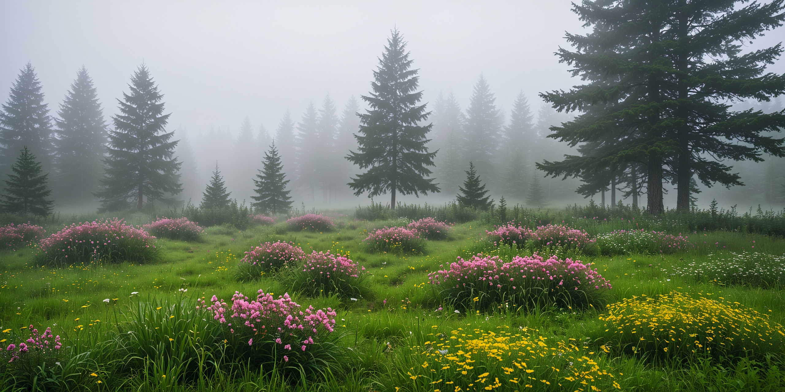 松树林中一片宁静而朦胧的草地。这张照片是在视线水平拍摄的,捕捉到了草地上郁郁葱葱的绿色植物和部分被雾遮住的高耸的松树。色调以柔和的绿色和灰色为主,点缀着鲜艳的粉红色和野花的黄色。构图是平衡的,草地占据了画面的下三分之二,森林隐没在朦胧的背景中。灯光暗示了柔和的漫射光,可能来自阴天,创造了平静宁静的氛围。