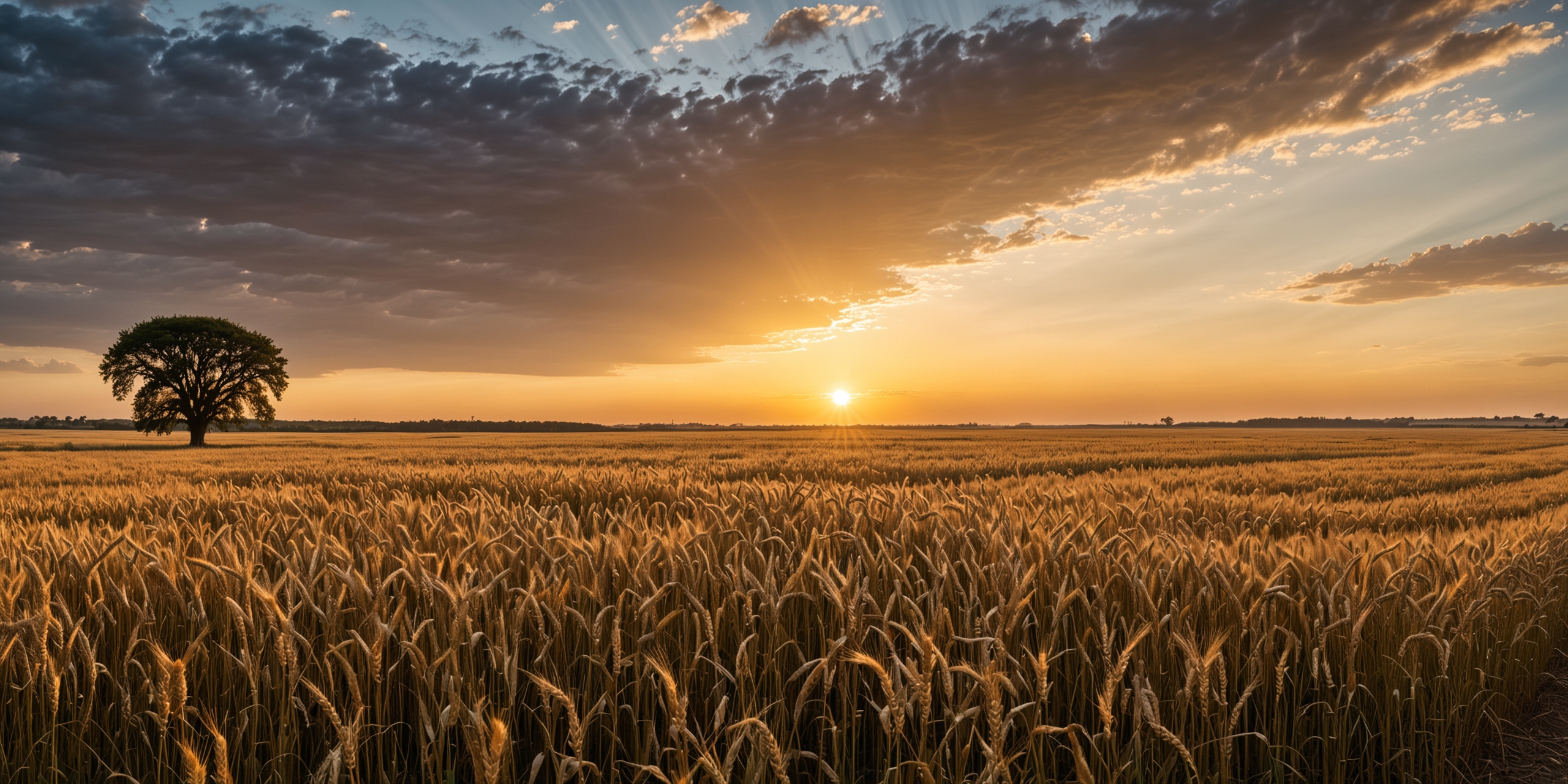 这是一张金色麦田上日落美景的照片。这张照片是从一个低角度拍摄的,突出了前景中高大、成熟的麦秆。麦田覆盖了整个图片的下半部分,一直延伸到远处的地平线,落日在天空中投射出温暖的橘黄色光芒。左侧的地平线上矗立着一棵孤零零的、枝繁叶茂的树,映衬着色彩斑斓的天空。照片的上半部分充满了戏剧性的云层,阳光穿过云层,创造了一种深度和宏伟的感觉。整体构图和灯光营造出一种宁静如画的乡村景色。