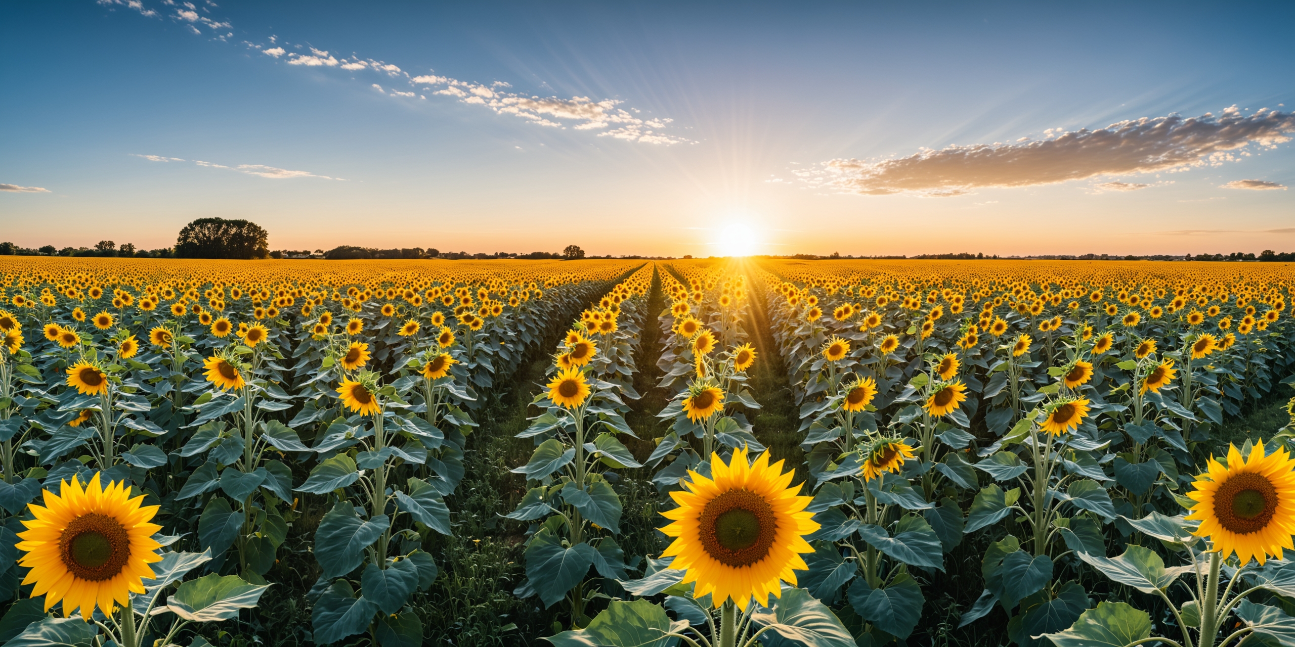 日落时向日葵田的照片。这张照片是从一个低角度拍摄的,可以看到广阔的视野,一直延伸到地平线。一排排高大的向日葵盛开,填满了前景和中间地带。落山的太阳,位于中心位置,投下温暖的金色光芒,穿过田野,形成长长的阴影,突出了向日葵鲜艳的黄色。天空是清澈的蓝色,缕缕高云被夕阳染成粉红色和橙色。整体印象是温暖、美丽和宁静。