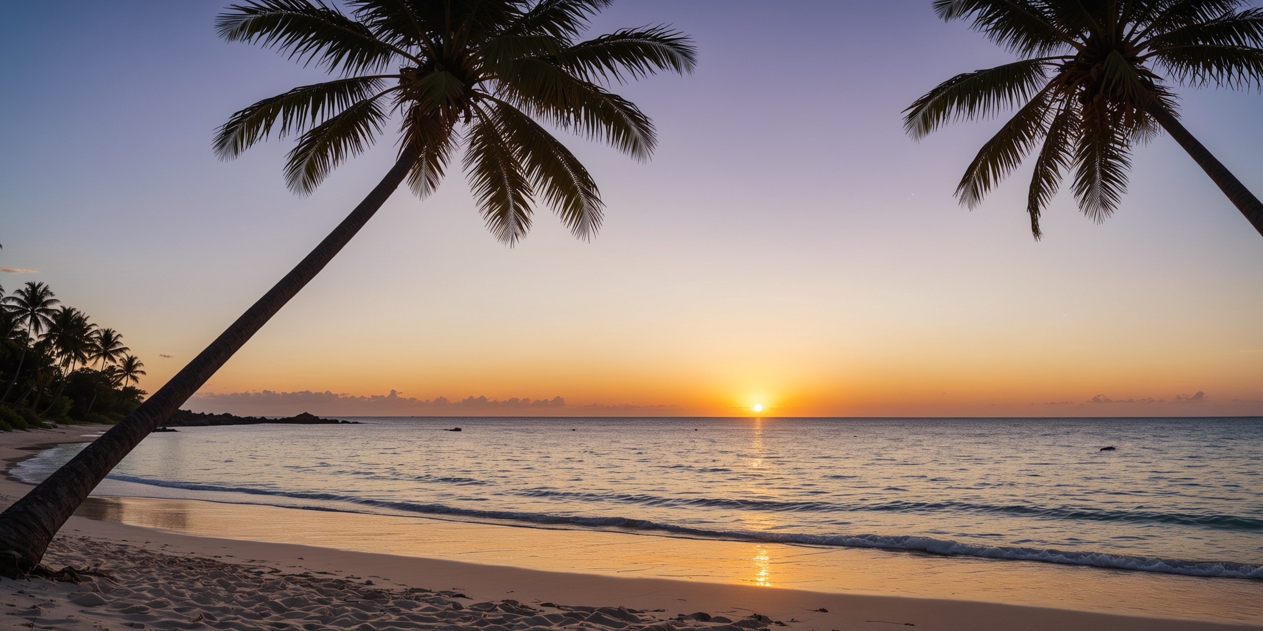 热带海滩上宁静日落的照片。这张照片是在海滩上从低角度俯瞰大海拍摄的。两棵棕榈树构成了画面,它们的树干从相对的两侧向画面中心倾斜。夕阳投下温暖的光芒在沙滩和水,创造一个宁静和诱人的氛围。色彩温暖诱人,橙色、黄色和粉色主宰着天空,反射在柔和的波浪上。整体构图平衡而宁静,给人一种平和宁静的感觉。