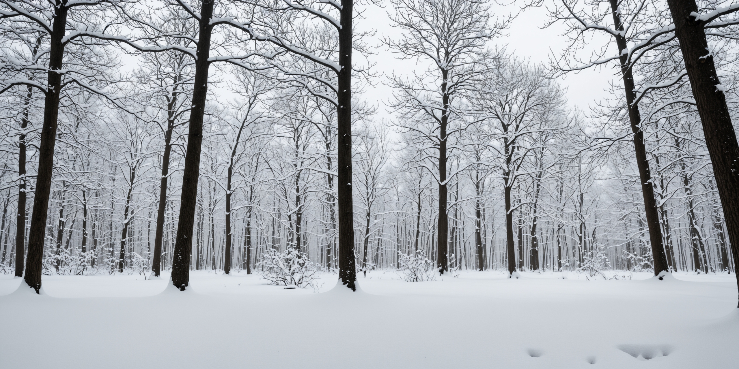 这是一张宁静的冬季森林照片。这张照片展示了密集的高大细长的树木,它们的树枝光秃秃的,上面覆盖着一层新雪。地面完全被原始的白雪覆盖,强调了冬季的荒凉之美。图片的整体色调是凉爽而柔和的,阴天在整个森林中投射出柔和的漫射光。构图相对简单,树木形成一个自然的框架,将观众的眼睛吸引到树林的深处。这张照片唤起了一种宁静和静止的感觉,捕捉了白雪覆盖的森林的宁静气氛。