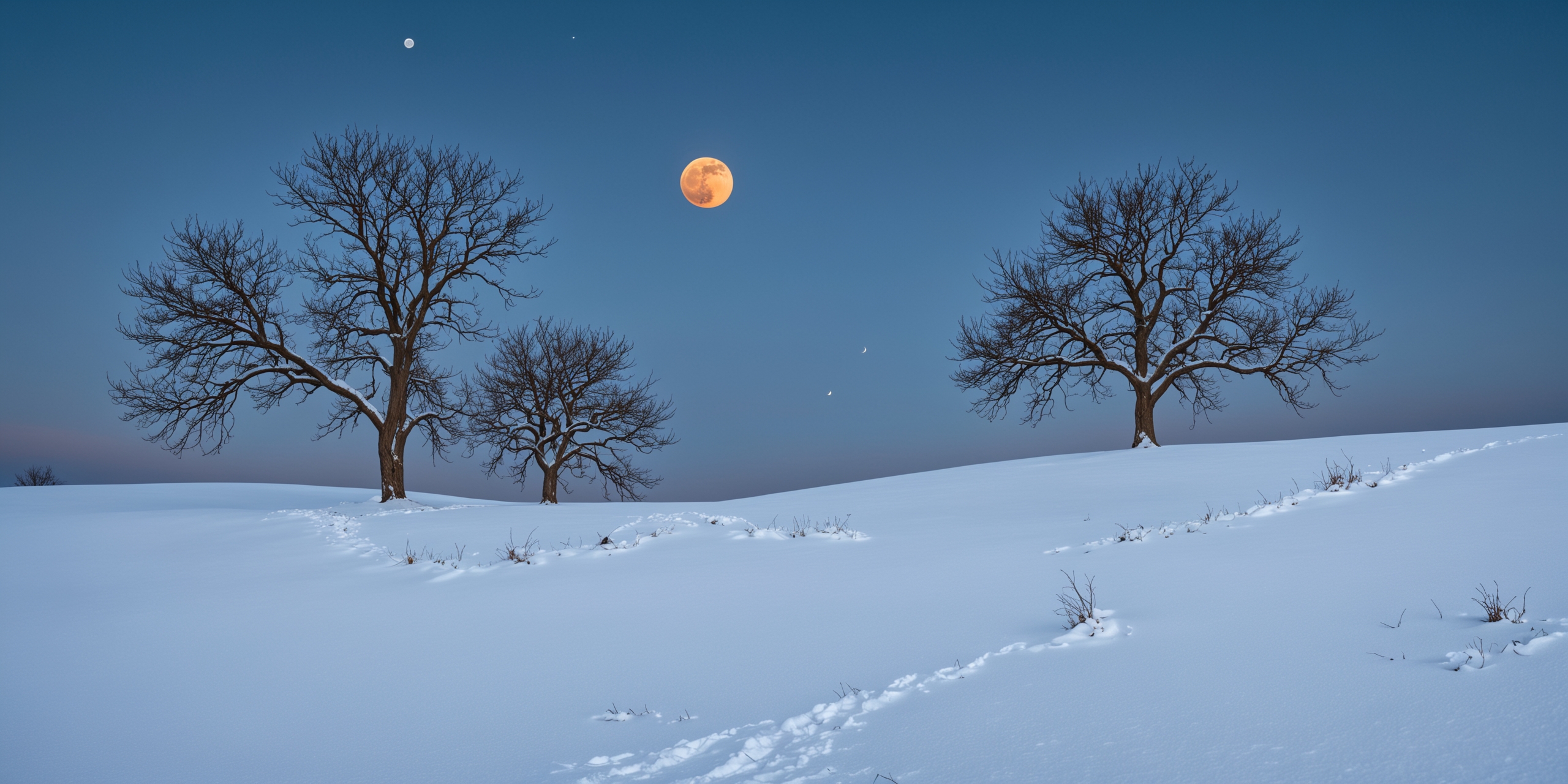 照片中,宁静的雪景沐浴在一轮冉冉升起的满月的飘渺光芒中。这张照片展示了一片原始的白雪覆盖的田野,上面有微妙的起伏,在雪地上蜿蜒而过的动物痕迹是它的标志。三棵光秃秃的落叶树映衬着暮色的天空,树枝伸向天空。天空在地平线附近呈现出深蓝色到淡粉色的渐变。明亮的满月,带着温暖的色调,主宰着天空,而一个较小的新月和一颗微弱的星星为天空锦上添花。整体构图唤起了一种宁静的感觉和冬天的荒凉之美。