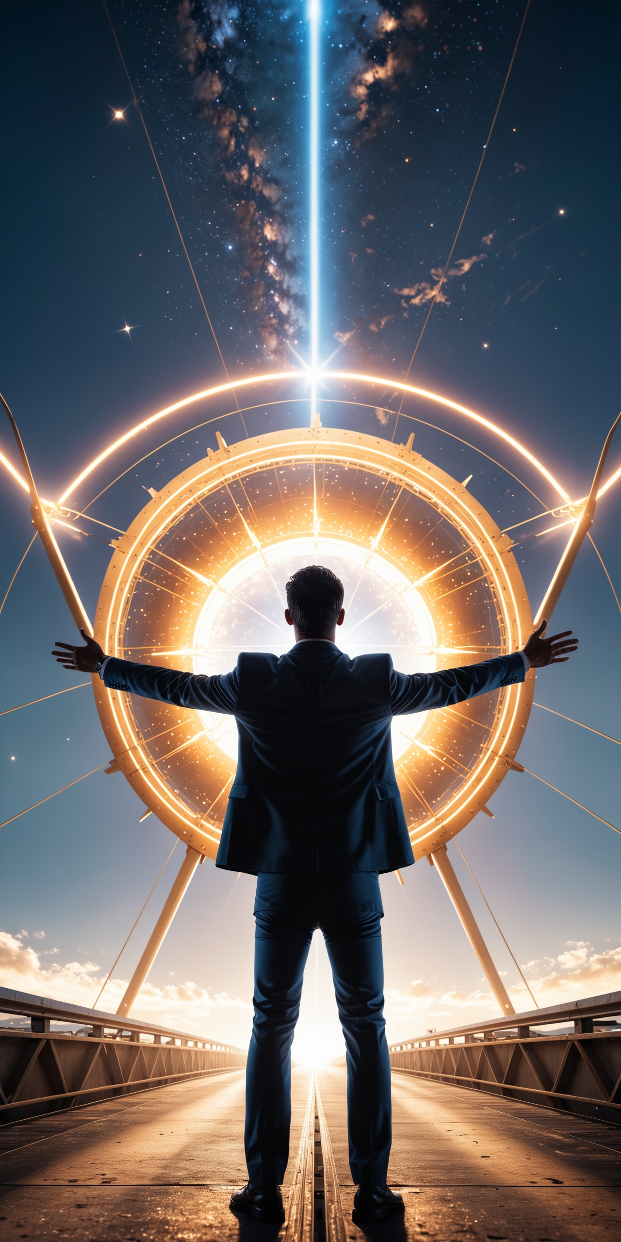 一个人站在桥上,站在未来的传送门前。一个穿着西装的男人站在桥上,张开双臂,面对着一个发光的圆形入口。传送门发出明亮的光,在桥和男人的剪影上投下温暖的光芒。这座桥的金属栏杆和背景中略带阴云的天空暗示着未来主义的背景。图像的整体构图强调未知,唤起一种惊奇和可能性的感觉。