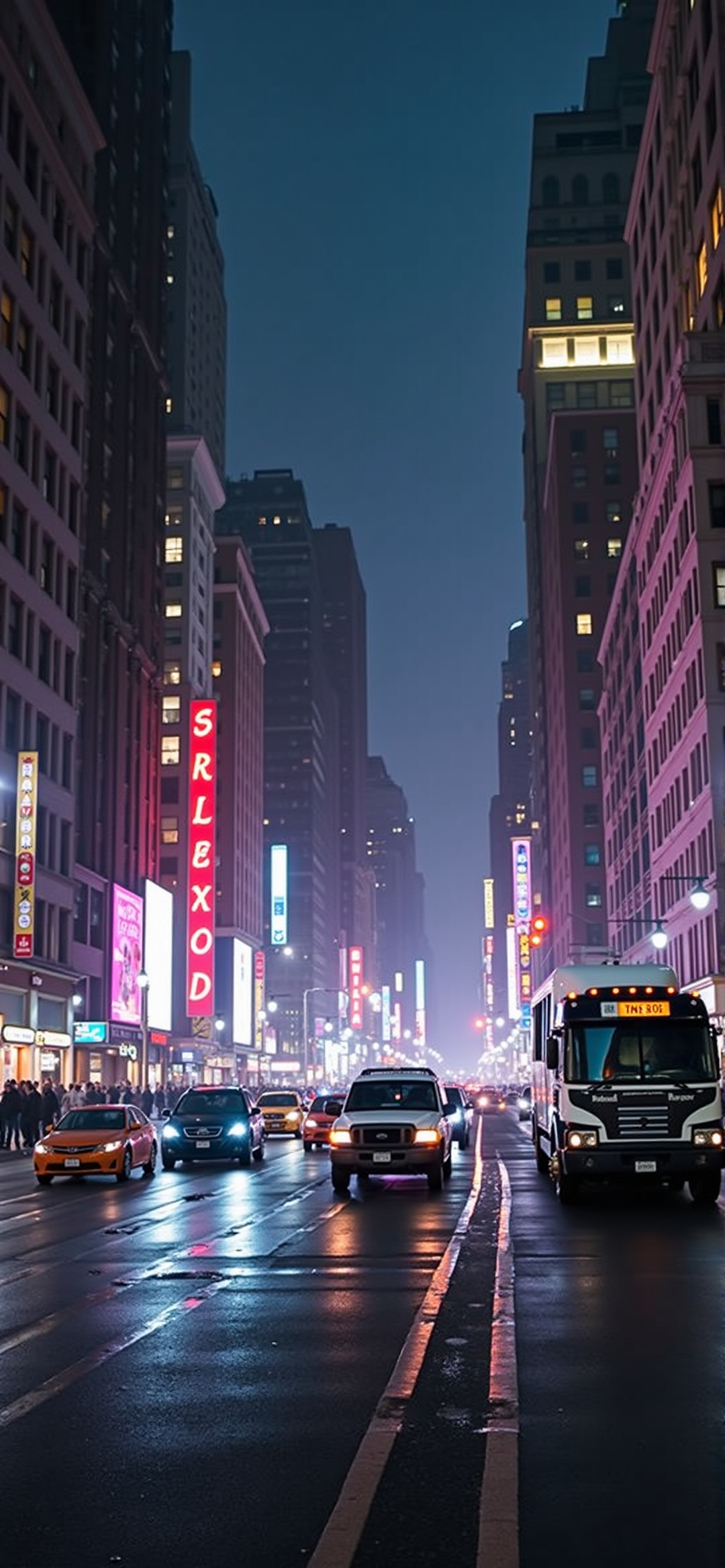 夜晚繁忙的城市街道的照片。这张照片是在街道中心线的一个较低的有利位置拍摄的,俯瞰着一条长长的大道。街道两旁的高楼大厦被街灯和霓虹灯照亮。两个方向上都有汽车行驶,它们的前灯发出了一道道的光。上面的天空阴暗多云,从潮湿的沥青上的倒影可以看出,暗示着最近下过阵雨。图像的整体情绪是电影化的,唤起了夜晚城市生活的能量。