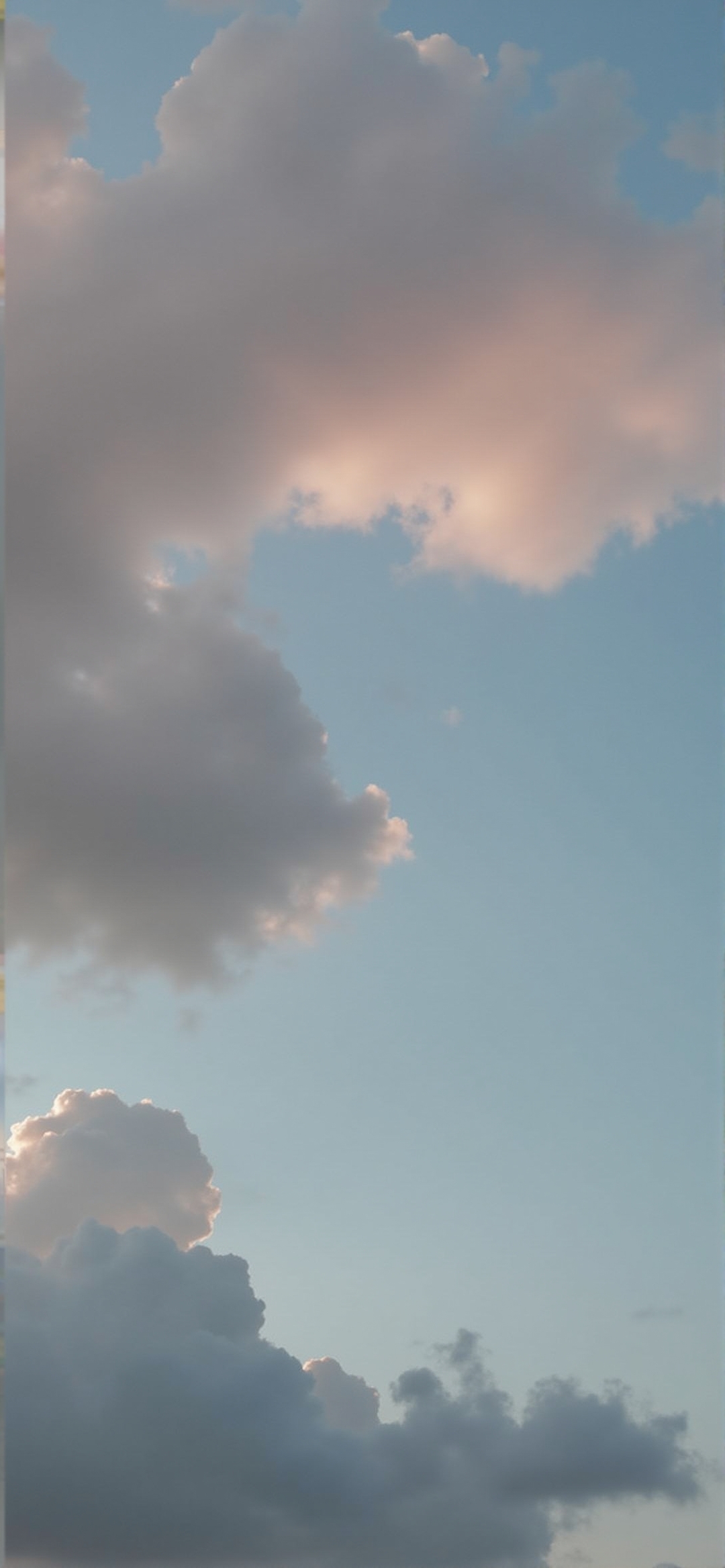 白天的天空布满了蓬松的大积云。云层主要是白色和浅灰色的,最上面的云被夕阳染成了柔和的玫瑰色。背景中的天空是淡蓝色,营造出一种宁静祥和的氛围。这张照片是从一个低角度拍摄的,使云在浩瀚的天空中显得宏伟壮观。