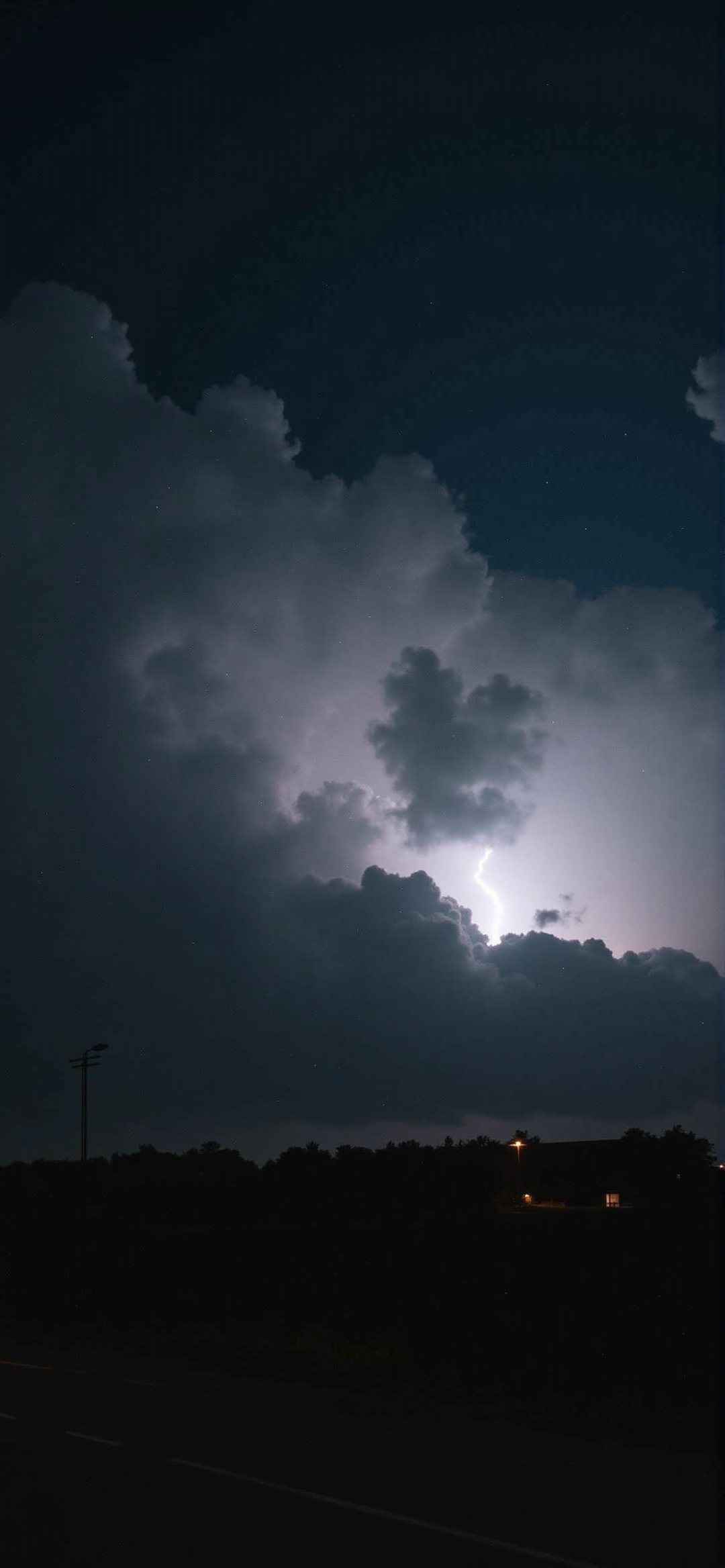 一个戏剧性的闪电照亮了黑暗多云的夜空。这张照片是从低角度拍摄的,强调了风暴云的高度和体积。一道闪电在云层中劈啪作响,明亮的白光与深蓝色和灰色的天空形成鲜明的对比。画面的下半部分是树木和一栋建筑的黑色剪影,在黑夜中几乎看不见,只有一盏孤独的路灯投下温暖的光芒。整体印象是一种敬畏,也许还有一丝不祥,捕捉到自然的原始力量。