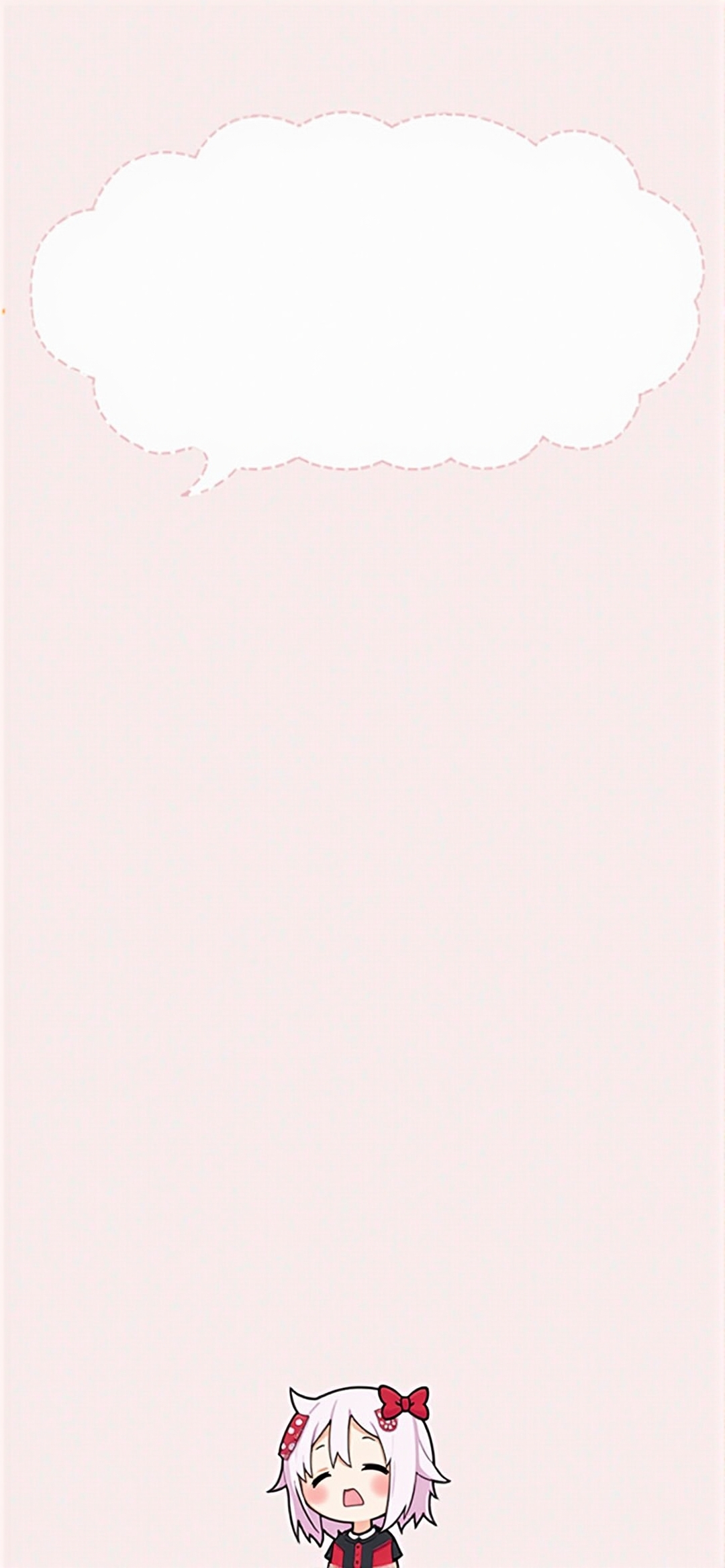 这是一个年轻的动画女孩的插图,位于一个巨大的空白思想气泡下,在一个坚实的粉红色背景上有一个虚线轮廓。这个女孩有一双白色的大耳朵,上面点缀着红白相间的圆点,脸颊上有粉红色的腮红,白色的头发有两缕垂在脸前。她穿着一件红黑相间的衬衫,头上戴着两个红白相间的圆点蝴蝶结。她的嘴张得很大,好像在兴奋地或惊讶地喊叫。整体的审美是可爱和俏皮的,暗示了一个轻松愉快的基调。这幅插图线条简洁,色彩鲜艳,很可能是用于社交媒体模板或装饰元素。